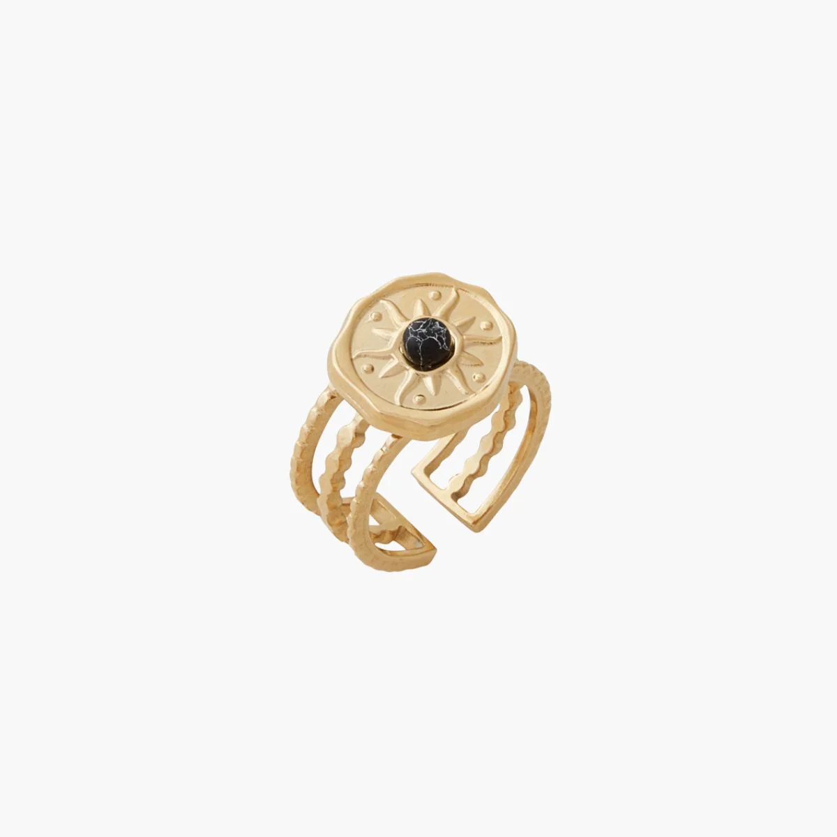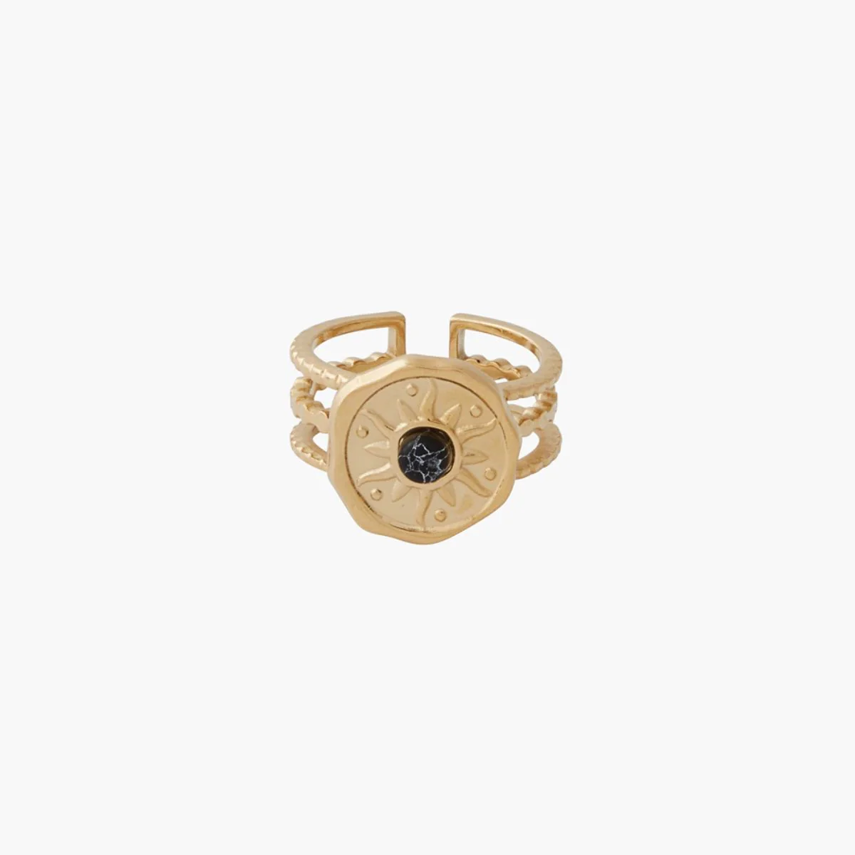 Bague médaillons avec pierre Taille ajustable Coloris : noir, doré 60% acier inoxydable, 40% pierre L’acier inoxydable est un matériau durable, résistant à l’usure, à la corrosion et aux rayures. Parfait pour un usage quotidien, il offre une brillance longue durée et nécessite peu d’entretien. Il est hypoallergénique et facile à nettoyer.