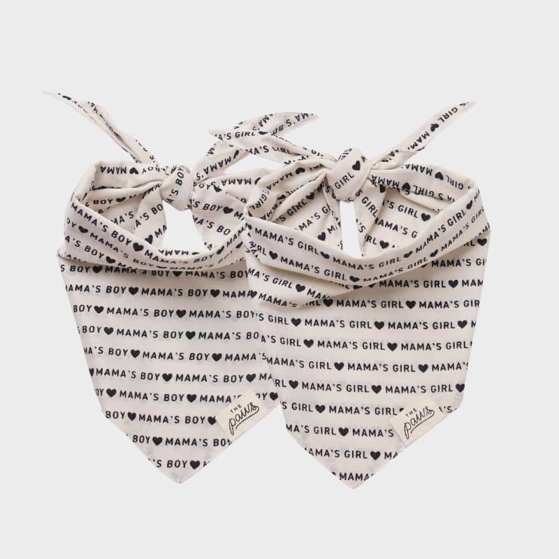 Avec le bandana pour chien “mama’s girl » ou « mama’s boy » de la marque The Paws, votre compagnon Ă quatre pattes sera le plus branchĂ© des toutous du quartier ! ConfectionnĂ© Ă 100% avec du coton et Ă la main, votre chien pourra montrer qu’il est bien le fils Ă maman ou bien la fille Ă maman ! đź’–