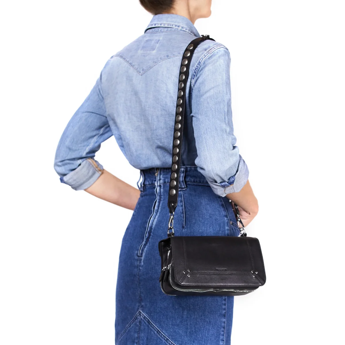 Bandoulière en cuir clouté, amovible grâce aux deux mousquetons. Peut être associée aux sacs Bobi, Bobi S, Igor, Billy M, Billy Nano, Stan Panier M, Lulu M, Pépito (S,M&L), Roger et Ben S.