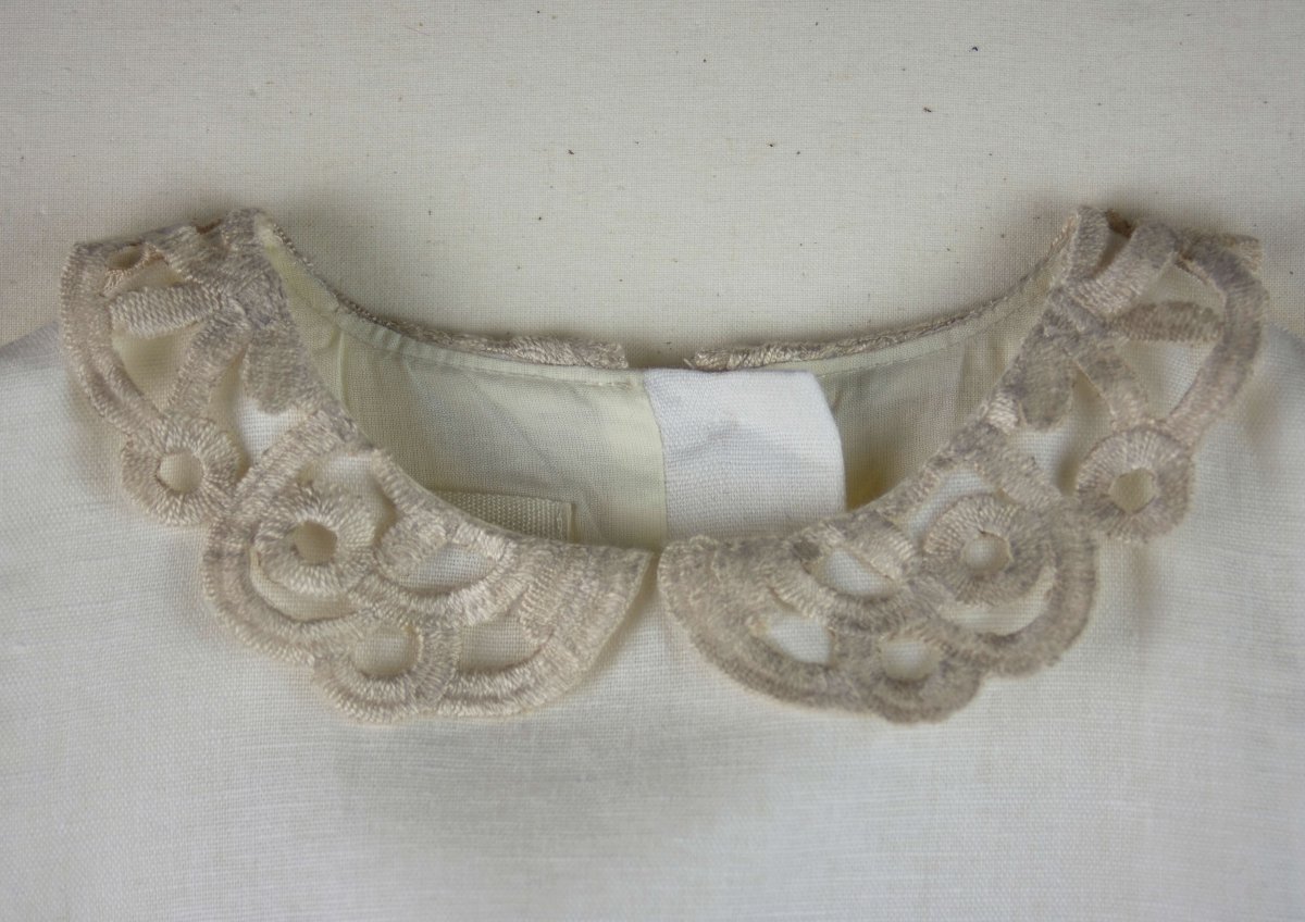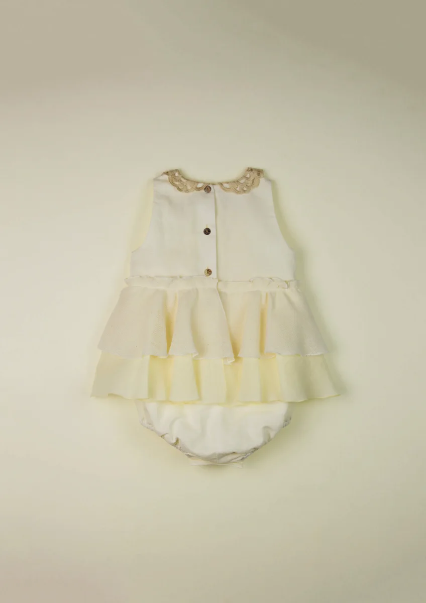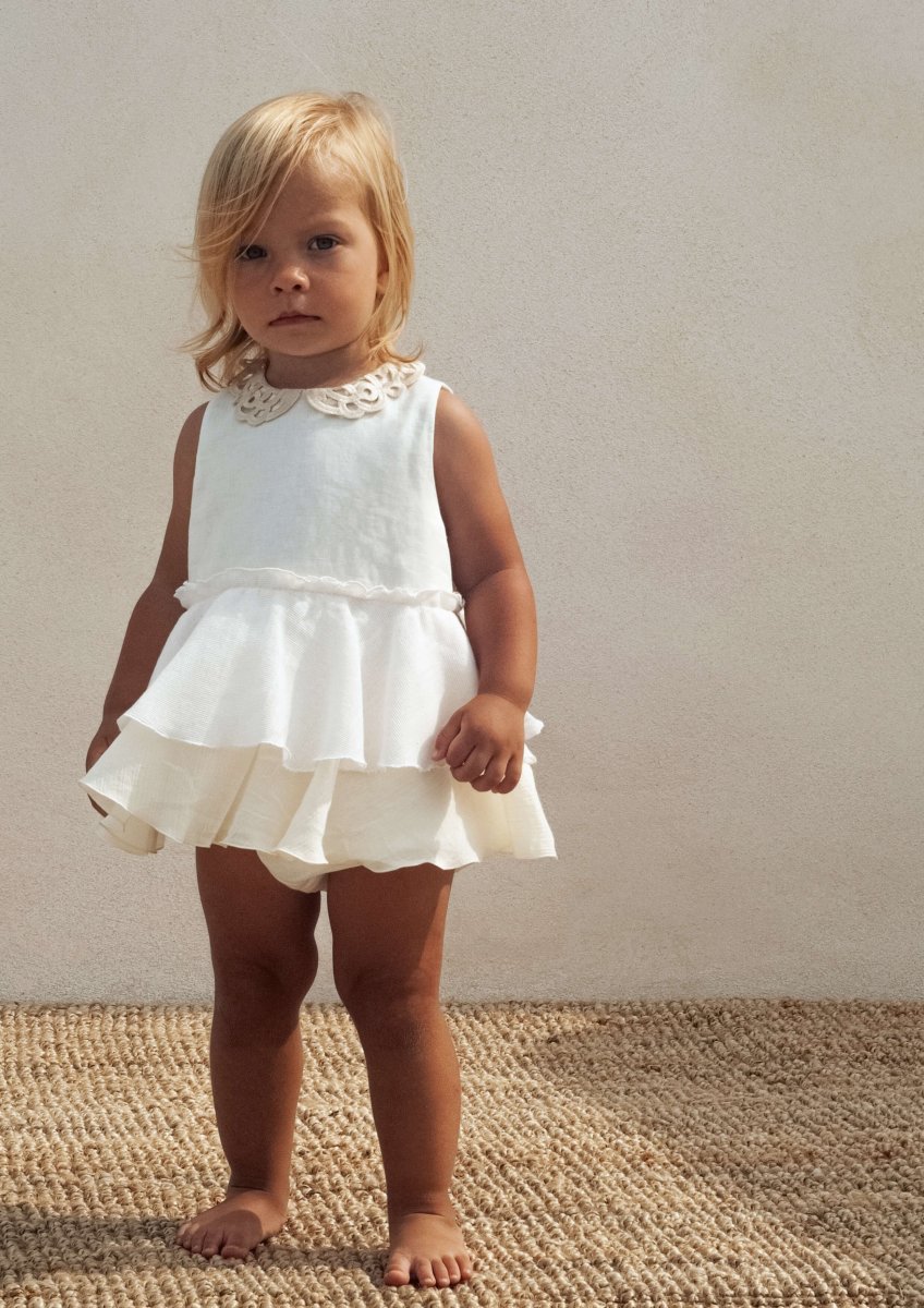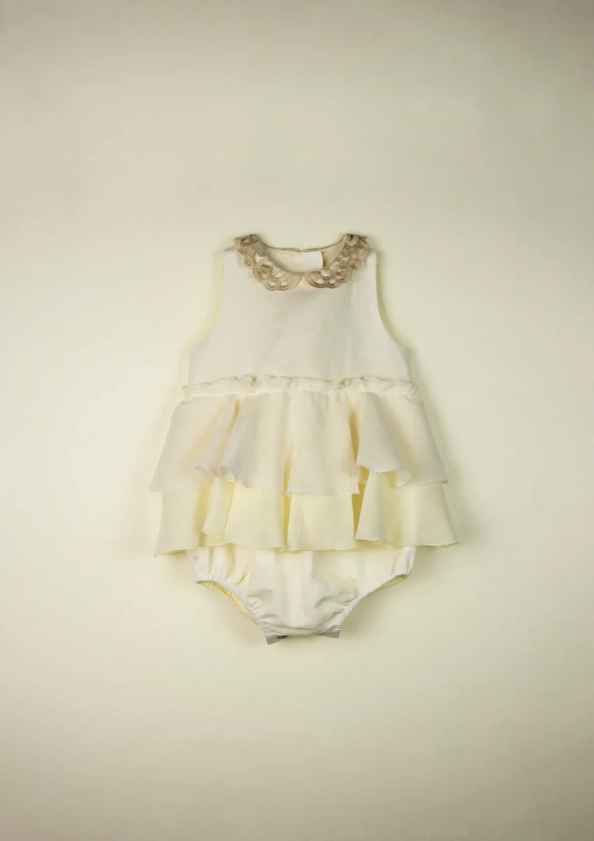 Barboteuse ivoire sans manches, jolie jupe vaporeuse faite d’une double rangée de tissu. Col contrastant en guipure brodée beige. Une tenue lumineuse pour les beaux jours et qui peut également faire office de tenue de cérémonie.