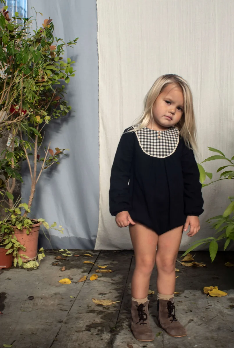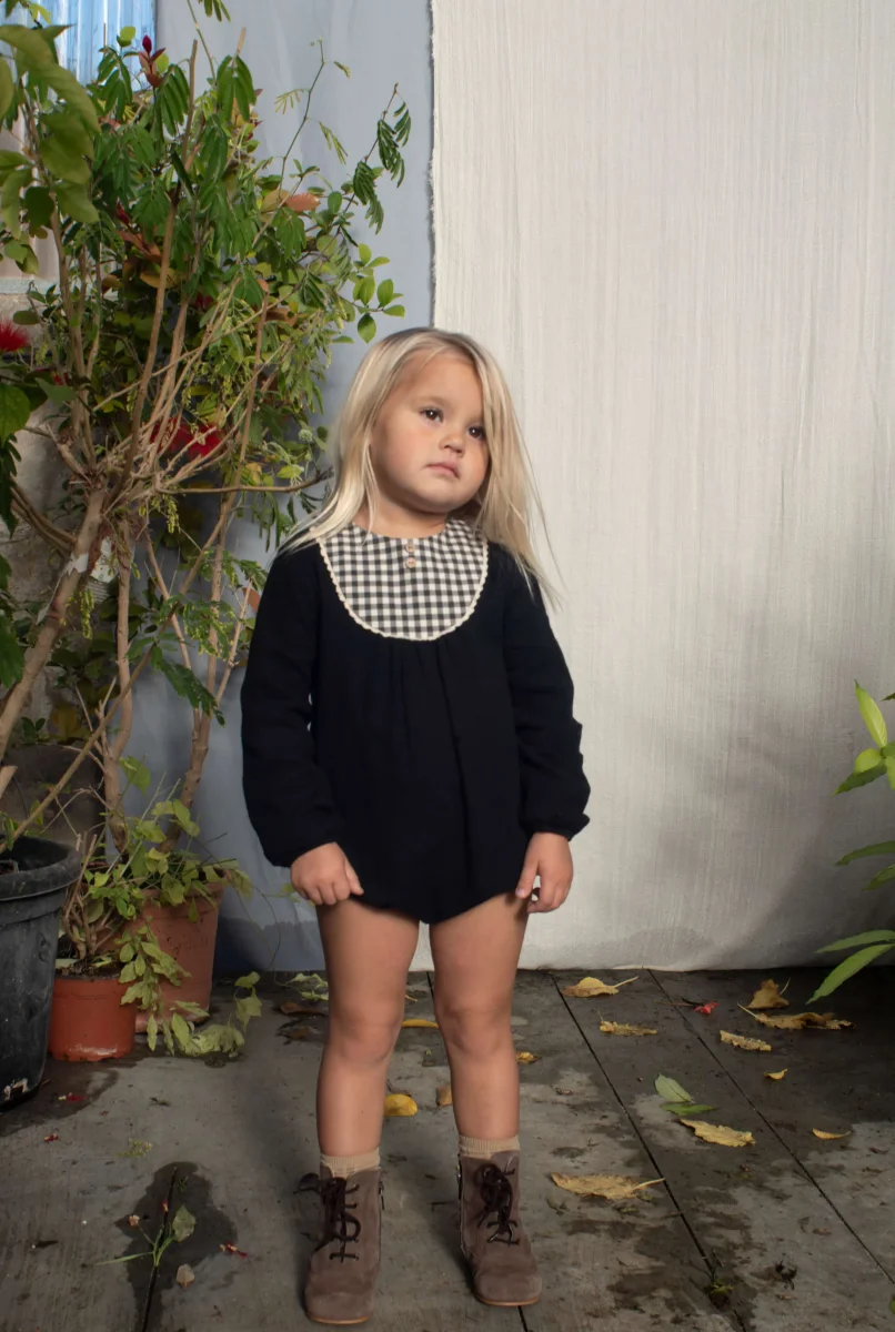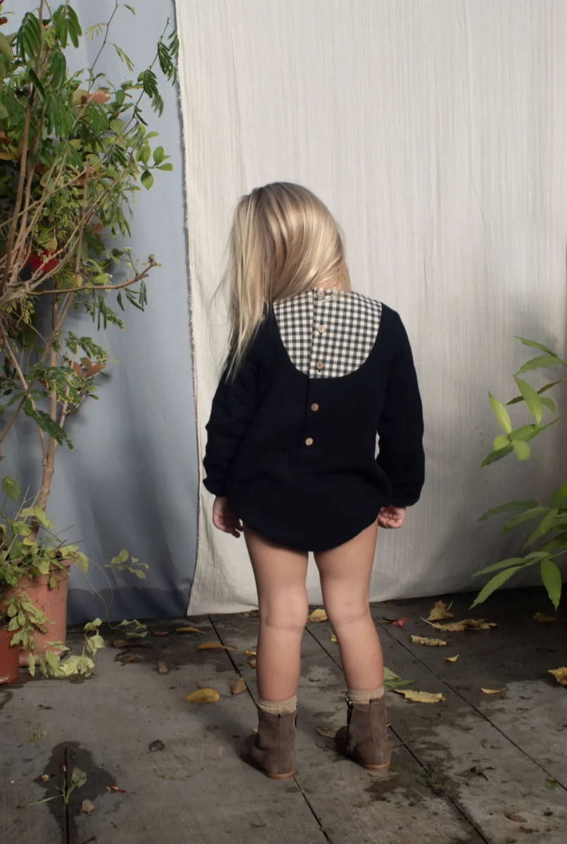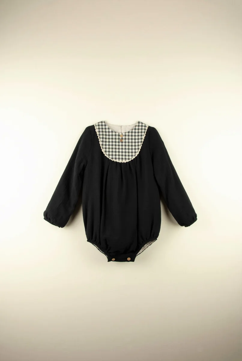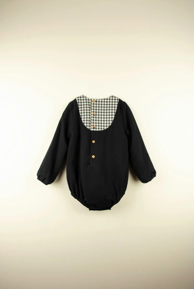 Barboteuse mixte en double gaze de coton bio noire, avec empiècement dans une toile de coton vichy noire et blanche et petits boutons au niveau du col. Manches longues légèrement bouffantes avec poignets froncés. Ouverture à l’arrière avec boutons en bois naturel et à l’entrejambe. Pour un matchy matchy adorable, vous avez la version grande sœur avec par exemple la robe noire Victorine ou la robe vichy Ingrid.