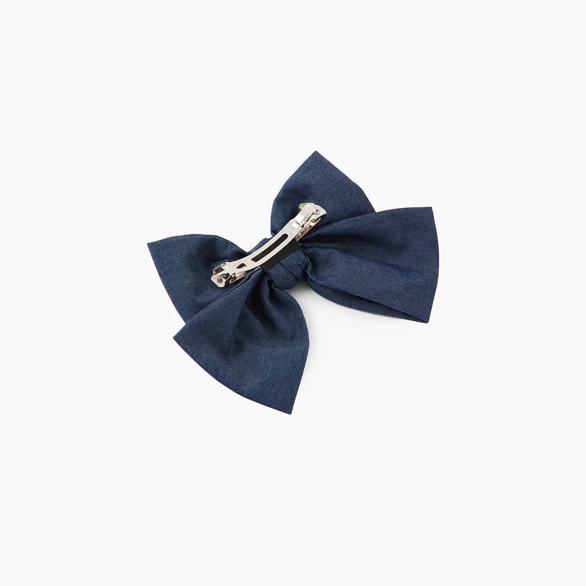 Barrette nœud en jeans Coloris : bleu Dimensions : 14×14 cm 80% polyester, 20% fer