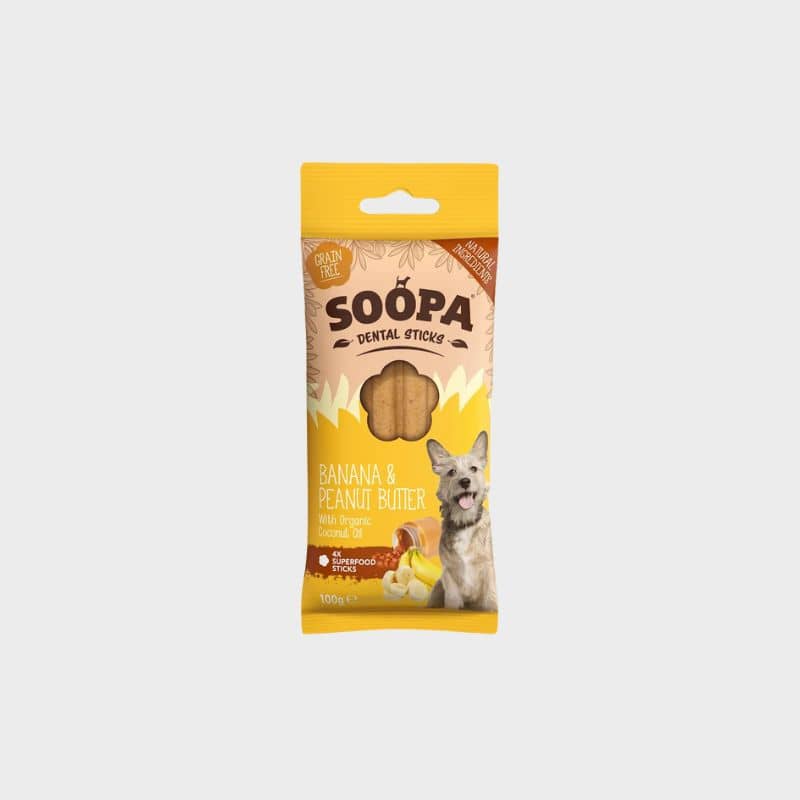 Ces bâtonnets dentaires à mâcher à la banane et peanut butter 🥜🍌 de Soopa sont parfaits pour entretenir les dents et gencives de votre chien. Sans céréales et vegan, ces dental sticks conviennent aux chiens sensibles.