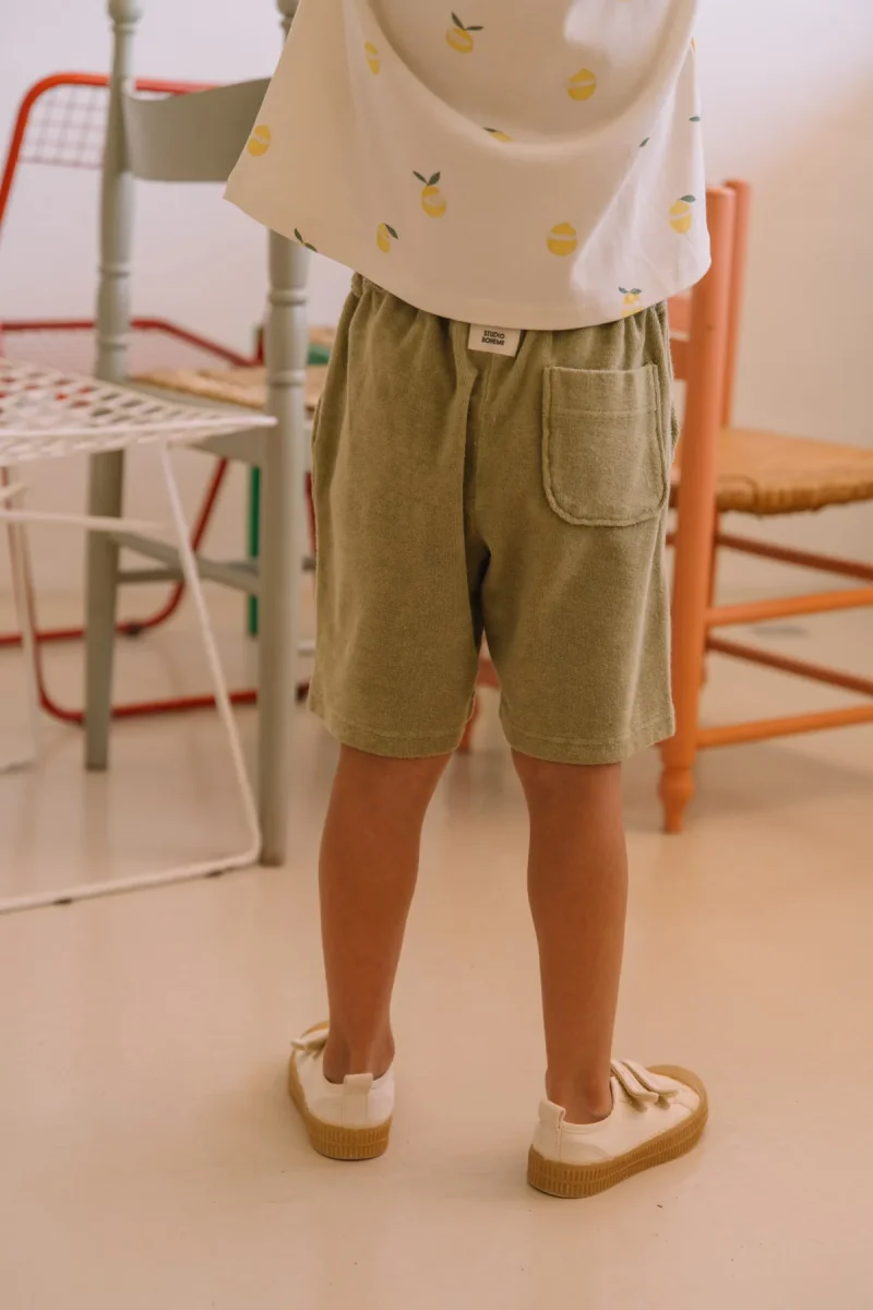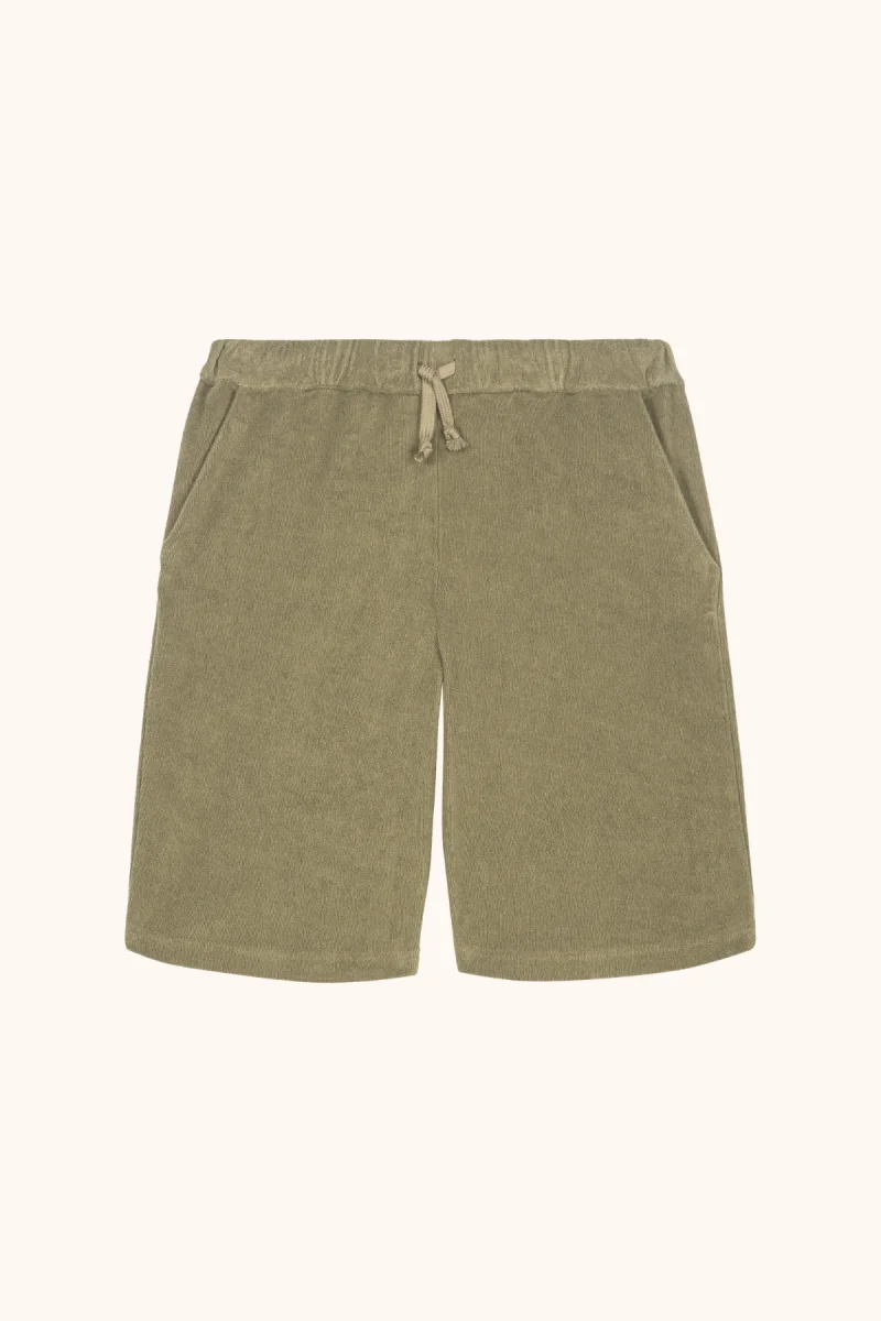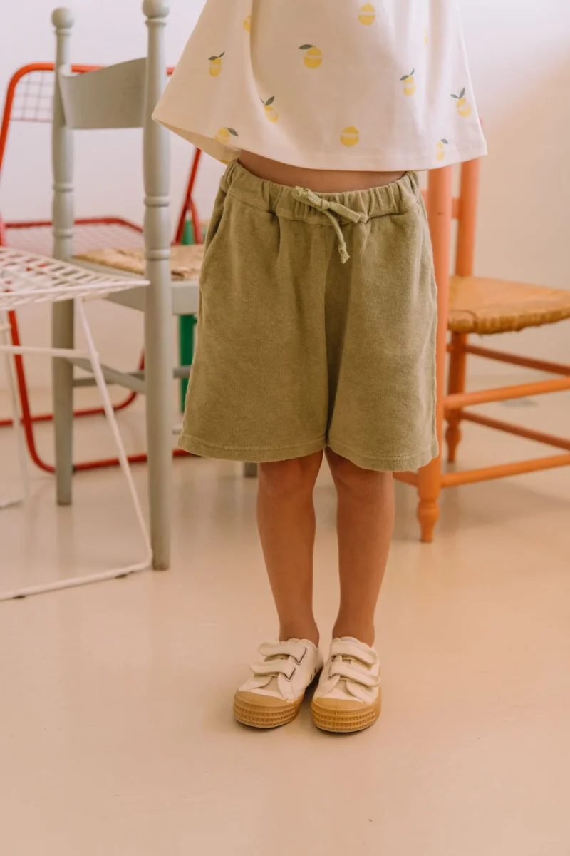 Bermuda en éponge de coton biologique.Ceinture élastiquée confortable pouvant être ajustée grâce au cordon de serrage.Poche arrière et étiquette Studio Bohème décorative au dos du bermuda.Fabriqué au Portugal.