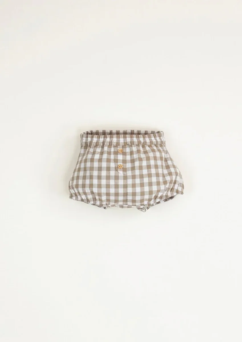 Bloomer vichy beige en coton bio avec taille et pattes élastiques. 2 petits boutons en bois sur le devant pour encore plus de charme.