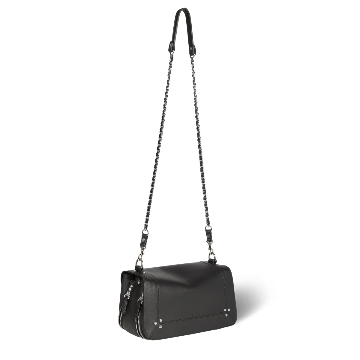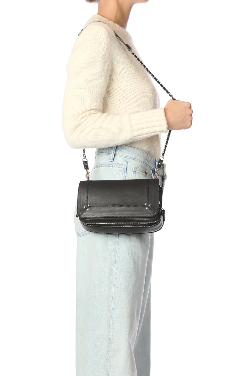 Une bandoulière amovible tressée cuir et chaine réglable en deux longueurs : 65 cm ou 105 cm.. Fermeture par un rabat en cuir aimanté. Sac organisé en trois compartiments. Volume ajustable par deux soufflets zippés. Un miroir amovible et un lien porte-clés à l’intérieur du sac.