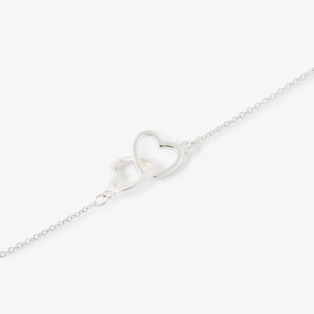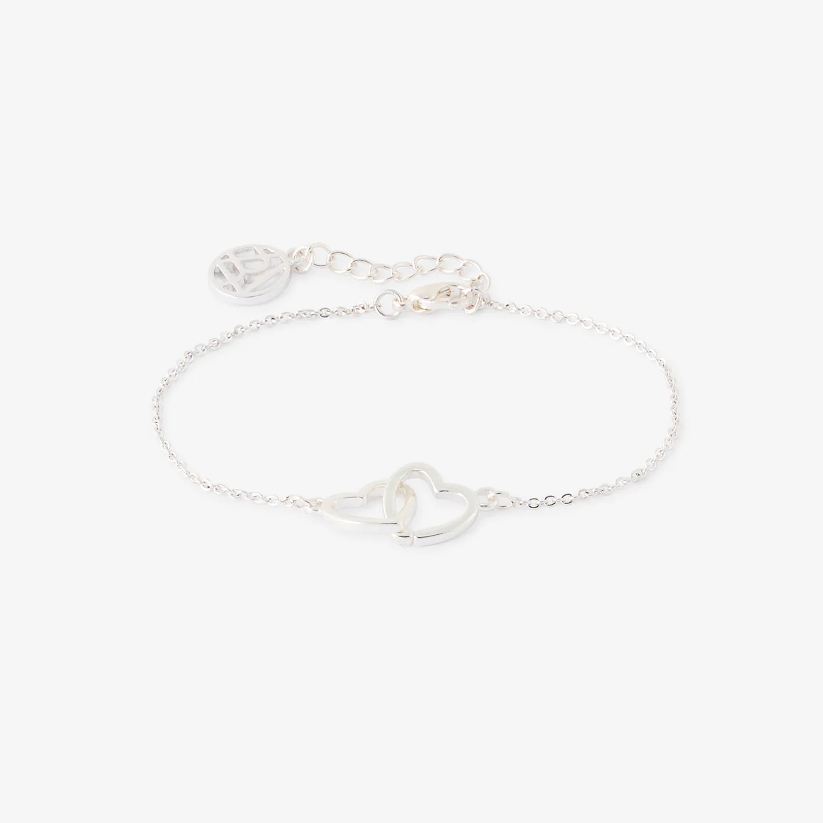 Bracelet chaine fine avec 2 cœurs entremêlés Fermoir à mousqueton, longueur ajustable Coloris : argenté 60% acier, 40% zinc Longueur : 17 + 3 cm