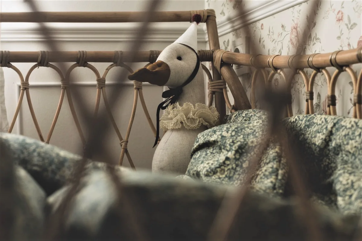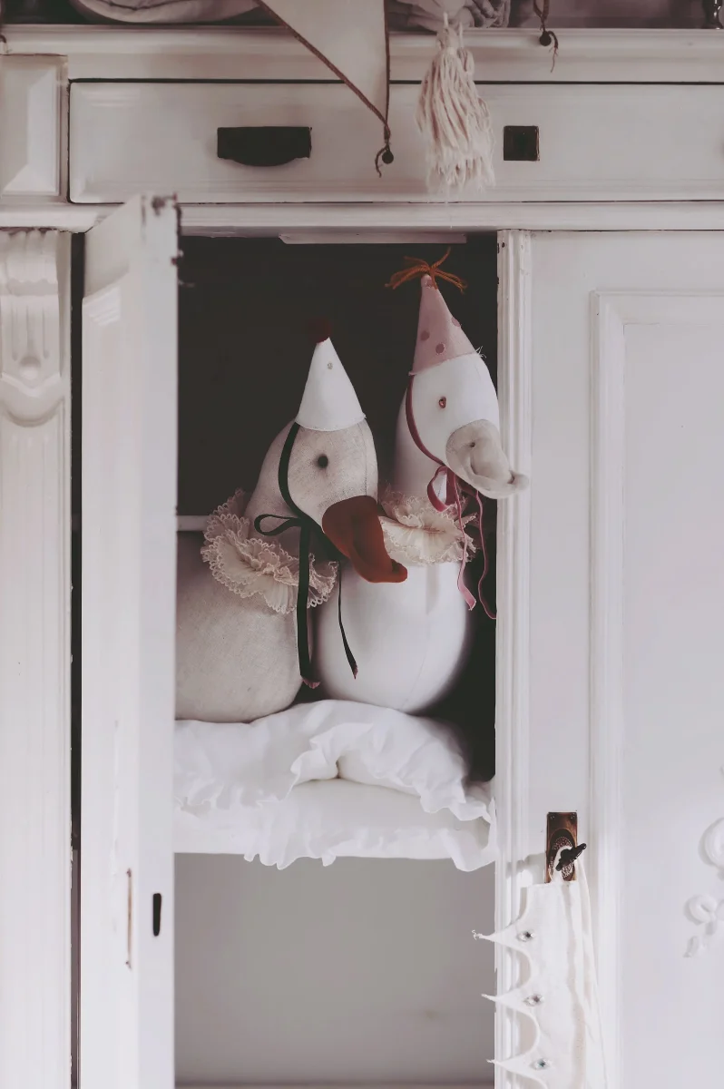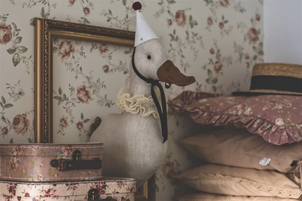 Élégant canard en lin beige avec collerette et chapeau pointu à accrocher au mur. Un personnage attendrissant pour une chambre empreinte de magie, d’imaginaire et d’évasion. Cette décoration murale peut aussi se poser dans le lit comme compagnon de chambre 😉