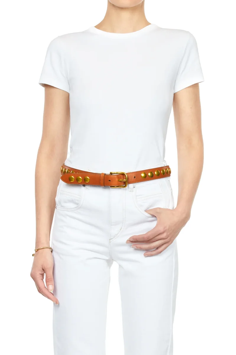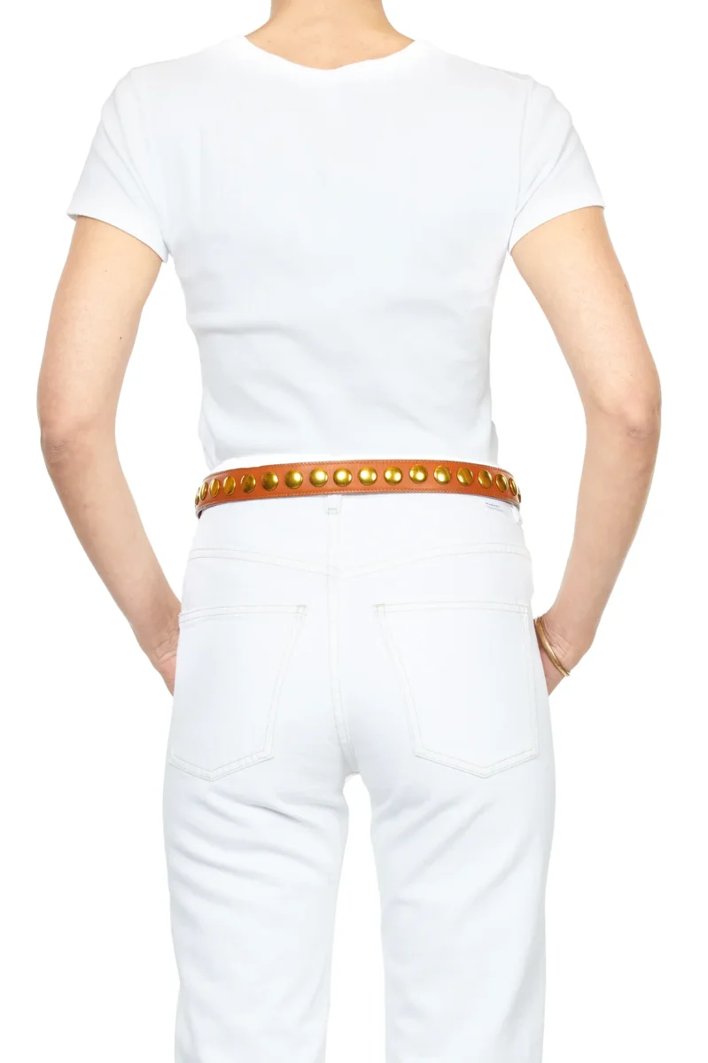 Ornée de larges rivets métalliques bombés. Ceinture réglable. Porté hanche ou taille haute.