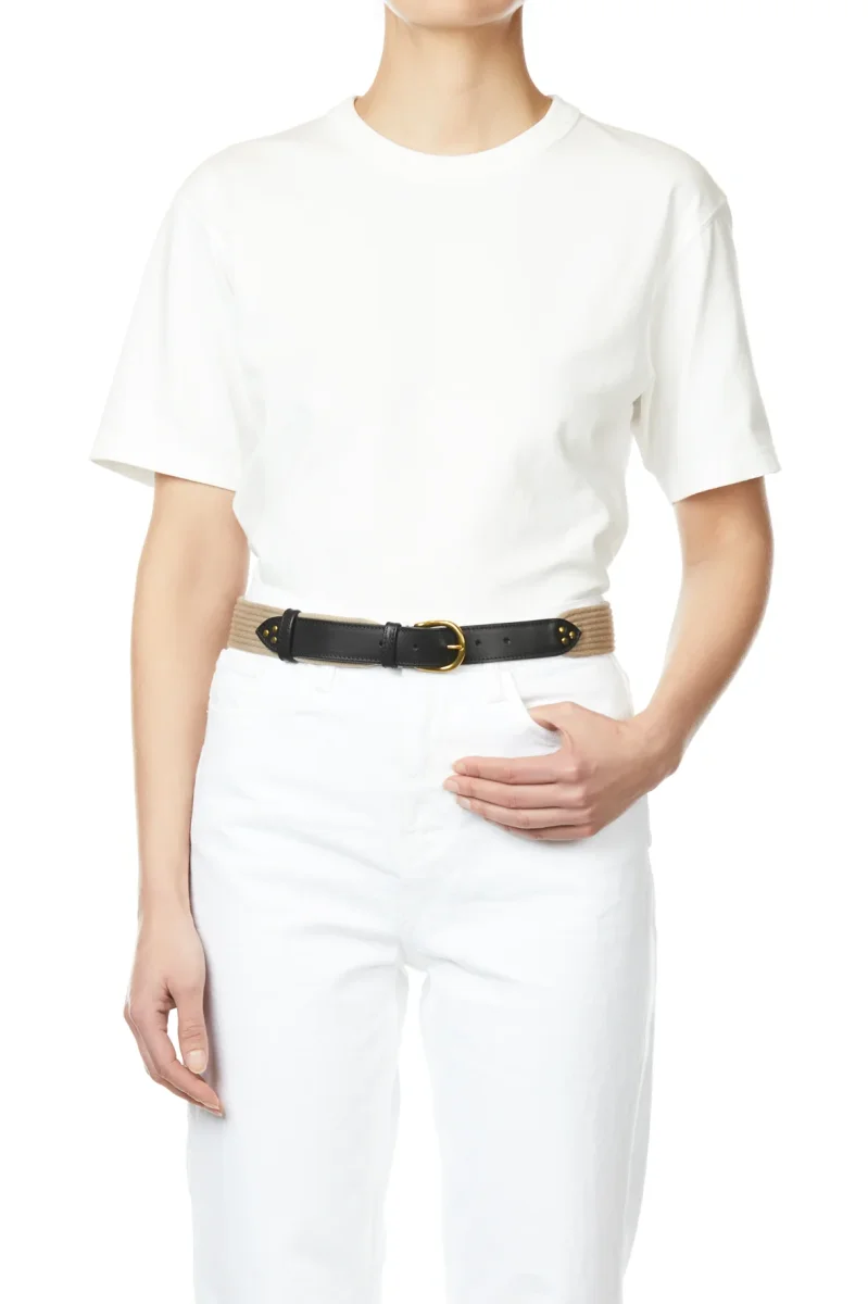 Coton garnie de cuir. Ceinture réglable. Porté hanche ou taille haute. Dimensions (longueur de la boucle au trou du milieu) : XS : 75 cm S : 85cm M : 95cm