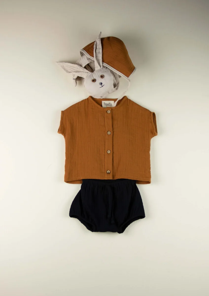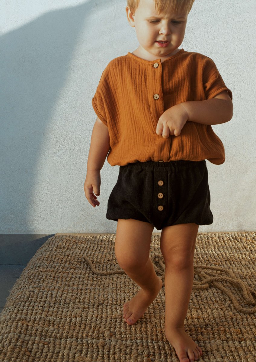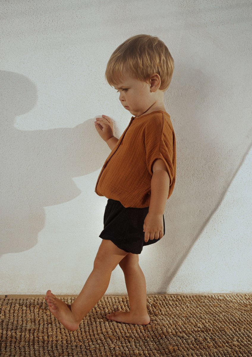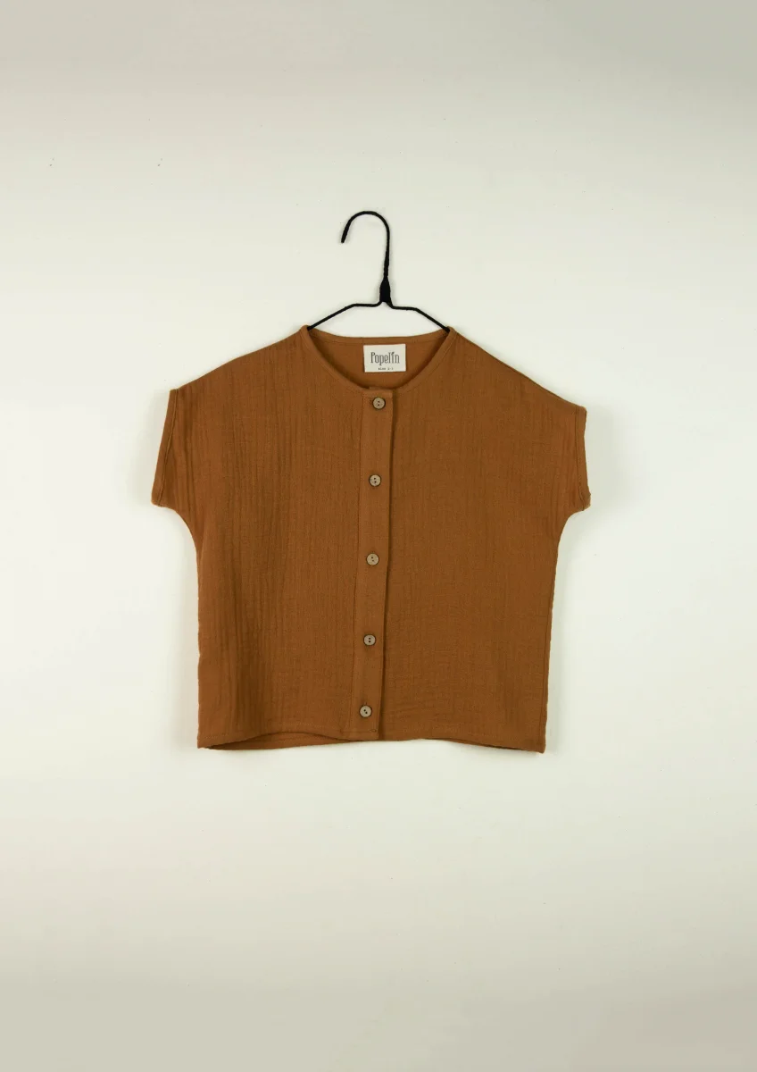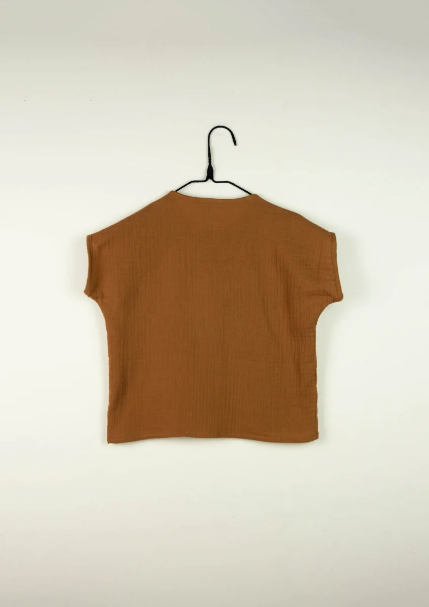 Chemise couleur cannelle en gaze de coton bio avec boutons en bois naturel. Encolure et manches courtes en biais. A porter par exemple avec les bloomers Anton ou la salopette Basile.
