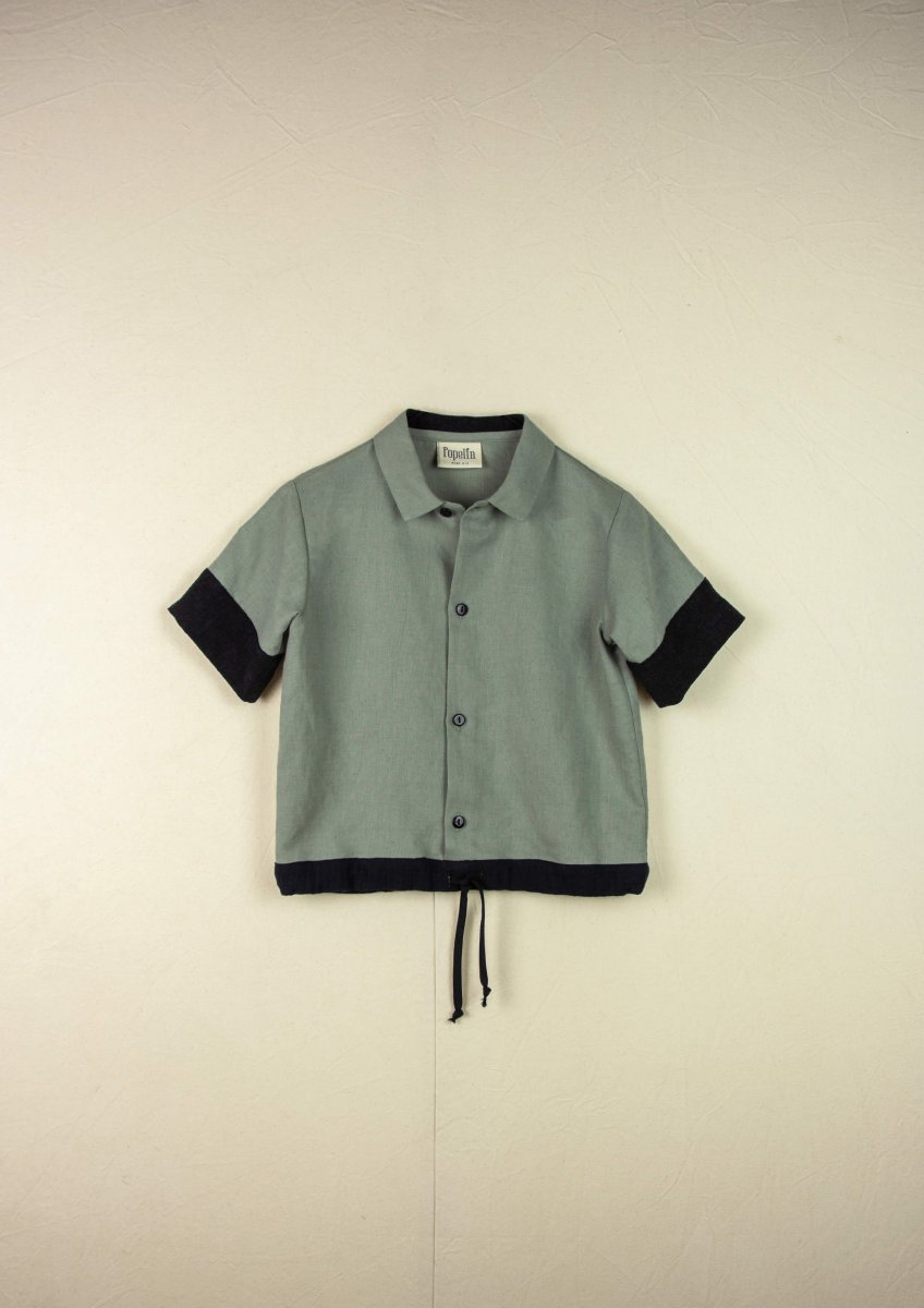 Chemise à manches courtes vert gris avec bords de manches, taille et cordon contrastés noirs. On aime son style épuré mais original ! Peut se porter pour les plus petits avec les bloomers Anton, et pour les plus grands avec les bermudas Roméo.