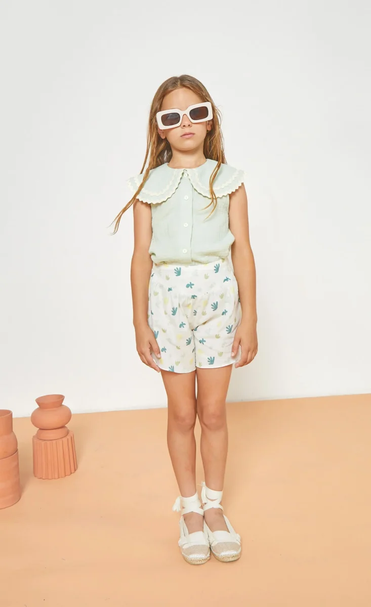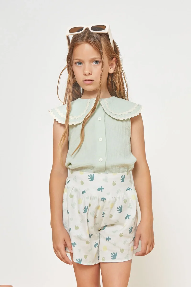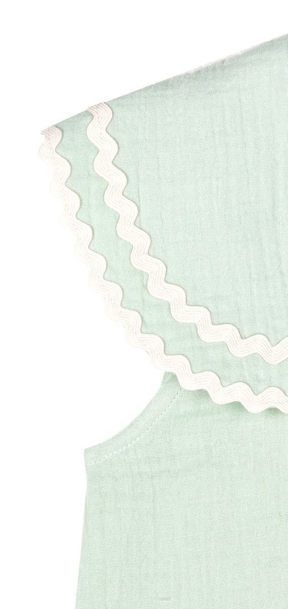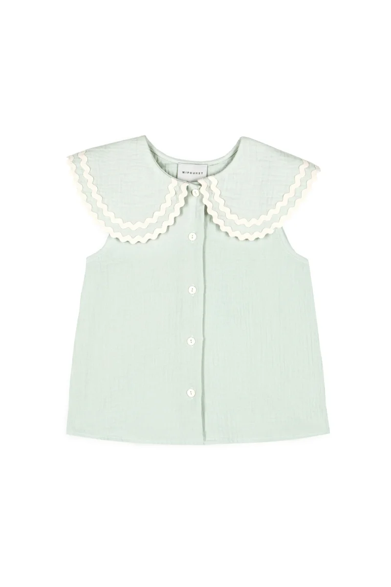 Beau chemisier sans manche au style preppy chic. Tellement adorable avec sa couleur vert d’eau, son grand col claudine généreux souligné par sa bordure de ruban ondulé, détail signature de la marque. Votre fille sera assurément très à l’aise dans cette mousseline de coton biologique légère et aérée. Une pièce sans manches parfaite pour les fortes chaleurs.