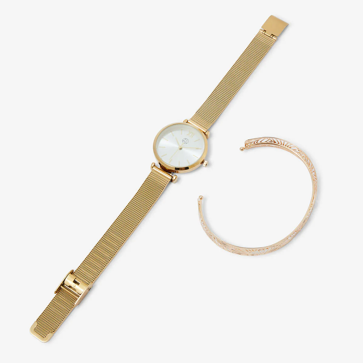 Coffret montre cadran rond bracelet maille dorée rose + bracelet