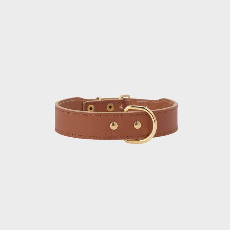 Le collier pour chien en cognac « Moni » de Branni Pets a été confectionné à Milan avec du cuir de veau saffiano. C’est un cuir plus solide et plus facile à entretenir qui a été créé par la célèbre marque de luxe Prada. Il est facilement reconnaissable grâce à sa finition hachurée emblématique.