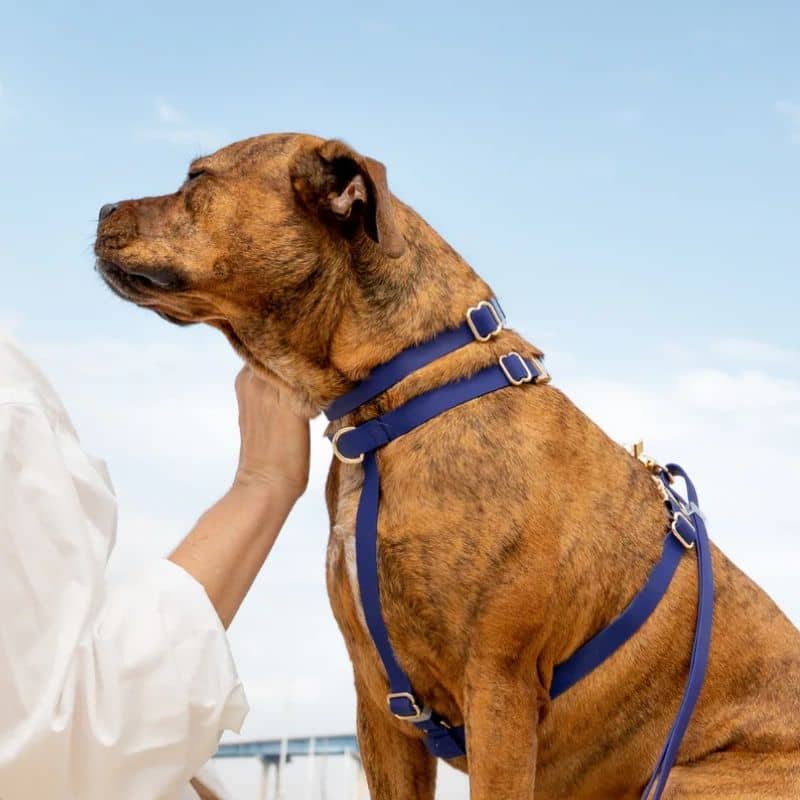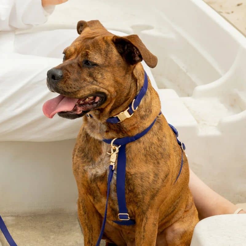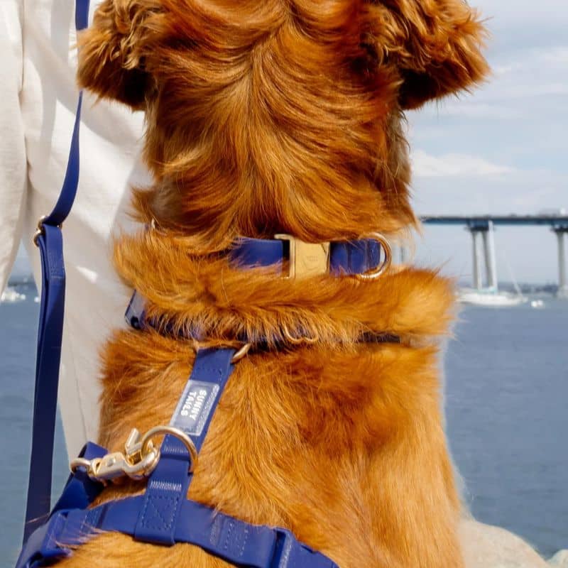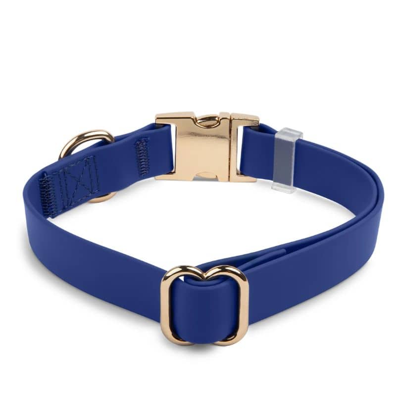 Le collier pour chien bleu marine « Sginature Navy » de la marque américaine Shop Sunny Tails vous permet de promener votre chien peu importe la météo grâce à sa matière imperméable. Il est confectionné à partir d’une sangle 100% vegan enduite de PVC – une matière plus durable que le cuir et similaire au biothane – et est également résistant (il a été testé pour résister à une traction de 300kg !). Une élégante boucle dorée permet d’ouvrir et de fermer rapidement le collier.