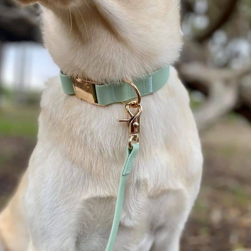Le collier pour chien « pistachio green » de la marque américaine Shop Sunny Tails vous permet de promener votre chien peu importe la météo grâce à sa matière imperméable. Il est confectionné à partir d’une sangle 100% vegan enduite de PVC – une matière plus durable que le cuir et similaire au biothane – et est également résistant (il a été testé pour résister à une traction de 300kg !). Une élégante boucle dorée permet d’ouvrir et de fermer rapidement le collier.