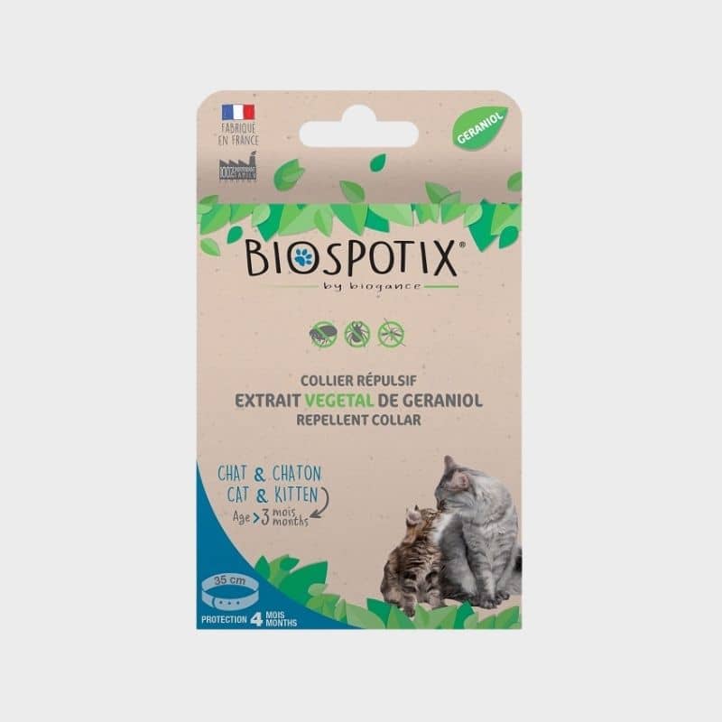 Le collier répulsif pour chat Biospotix par Biogance repousse naturellement les puces, tiques et autres insectes nuisibles grâce au géraniol. Très pratique, il libère le composant actif en continue qui se diffuse ensuite sur l’ensemble du pelage grâce au sébum : parfait pour ceux qui ont peur d’oublier d’asperger le chat avant les sorties !