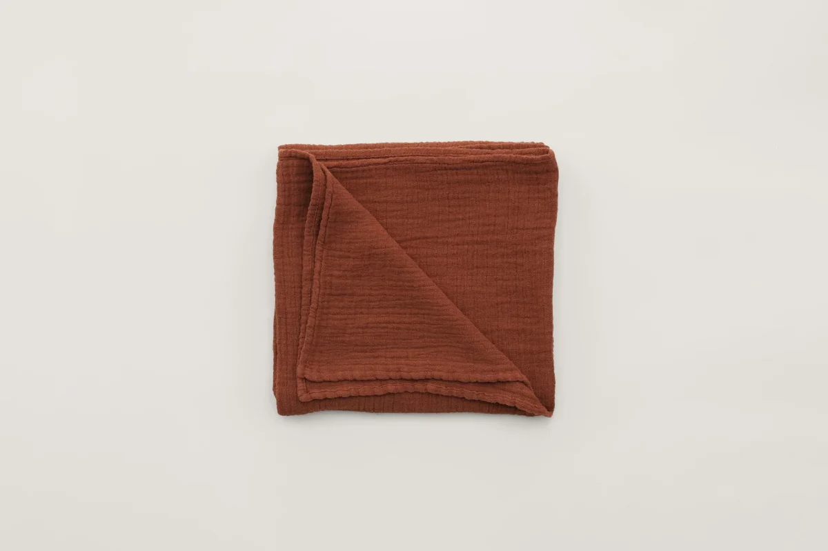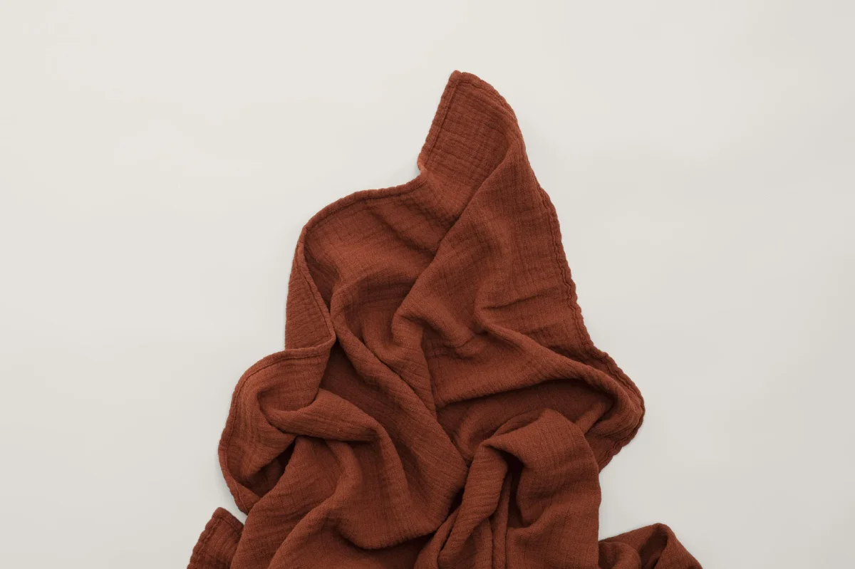Grand lange en mousseline de coton couleur terracotta teinté naturellement, très doux dans lequel votre enfant prendra plaisir à se blottir.