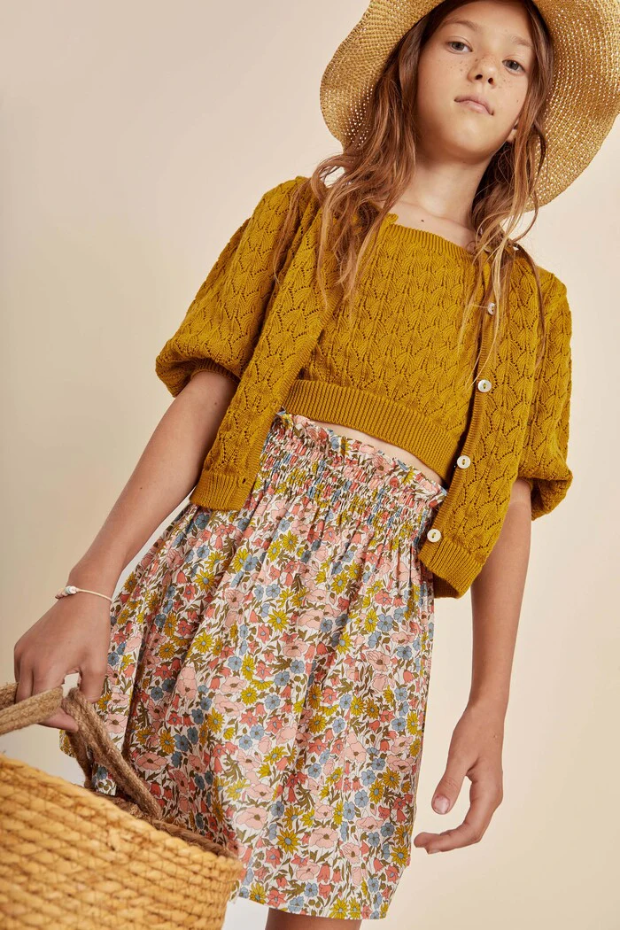 Ici nous sommes totalement fans des mailles d’été ! Ce débardeur Dakota en tricot ajouré et à bretelles épaisses se porte comme un crop top. Il présente le même motif floral que le cardigan Giulia et le short taille haute Dakota pour former un ensemble ravissant et estival. Une tenue originale caractéristique de la mode espagnole qui respire les belles journées ensoleillées. Les ourlets et bords sont côtelés, ils maintiennent bien la maille le long du corps. Vous pouvez aussi le porter avec la jupe Mia qui présente eux aussi des touches de cet original vert olive.