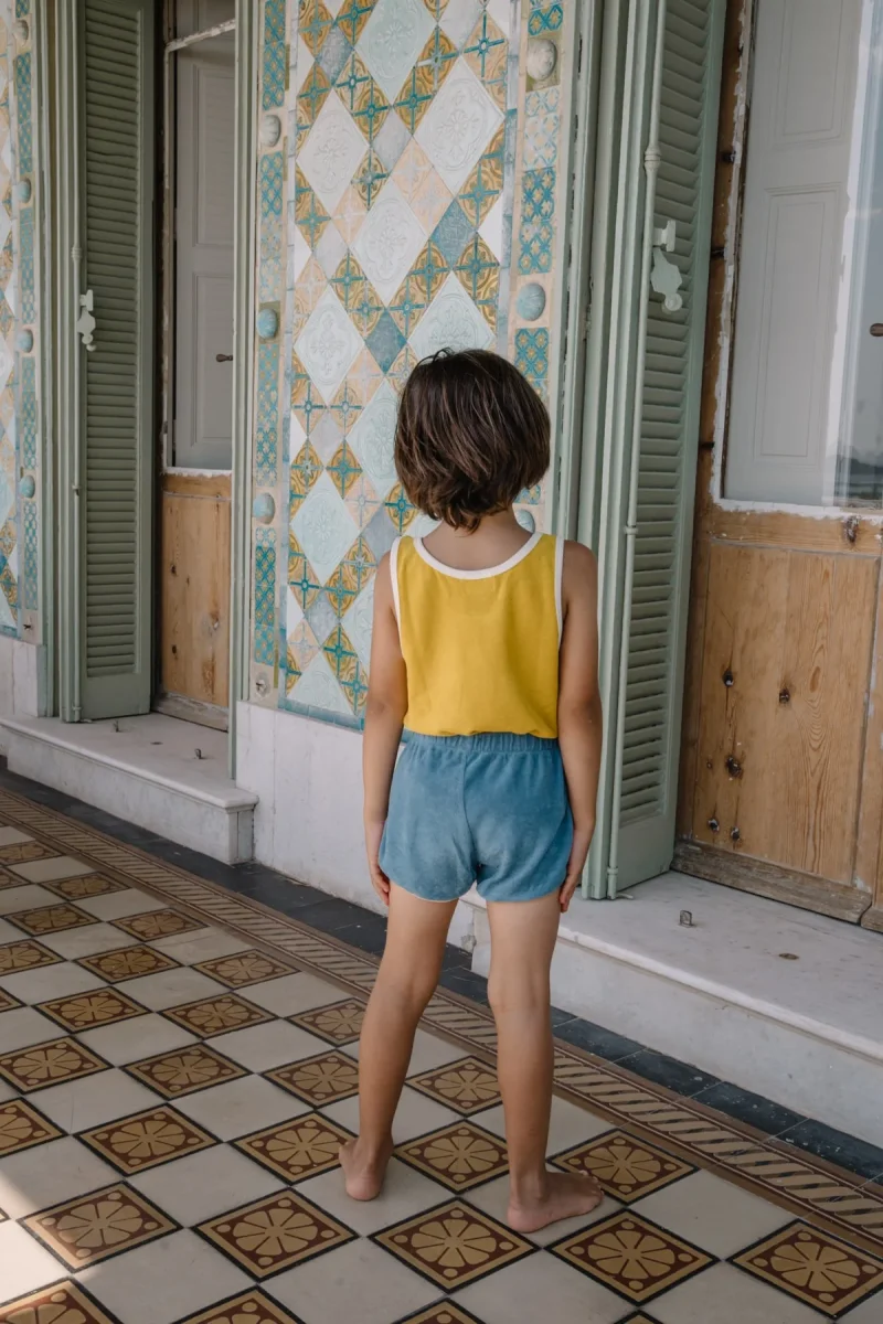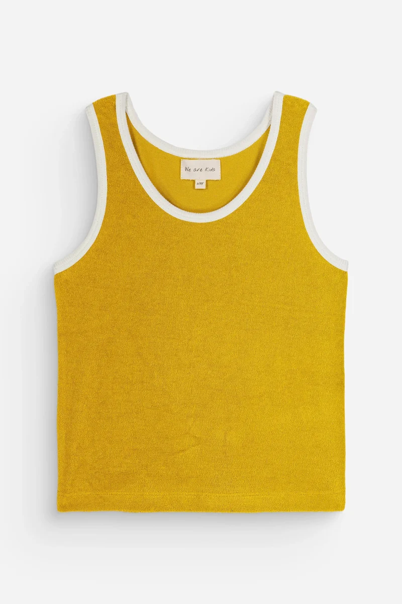 Débardeur mixte à encolure ronde couleur jaune foncé avec bords contrastés. Matière éponge toute douce et absorbante en coton bio.
