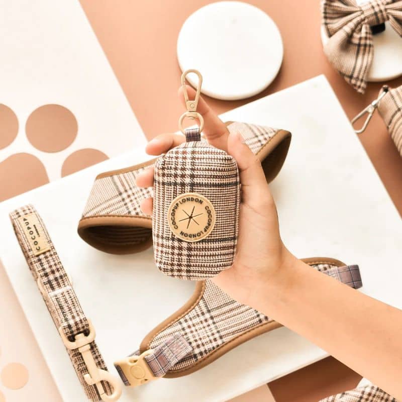 Vos promenades canines ne manqueront pas de style grâce au distributeur de sacs à déjection “Pup Plaid » à carreaux marron de la marque Cocopup London !
