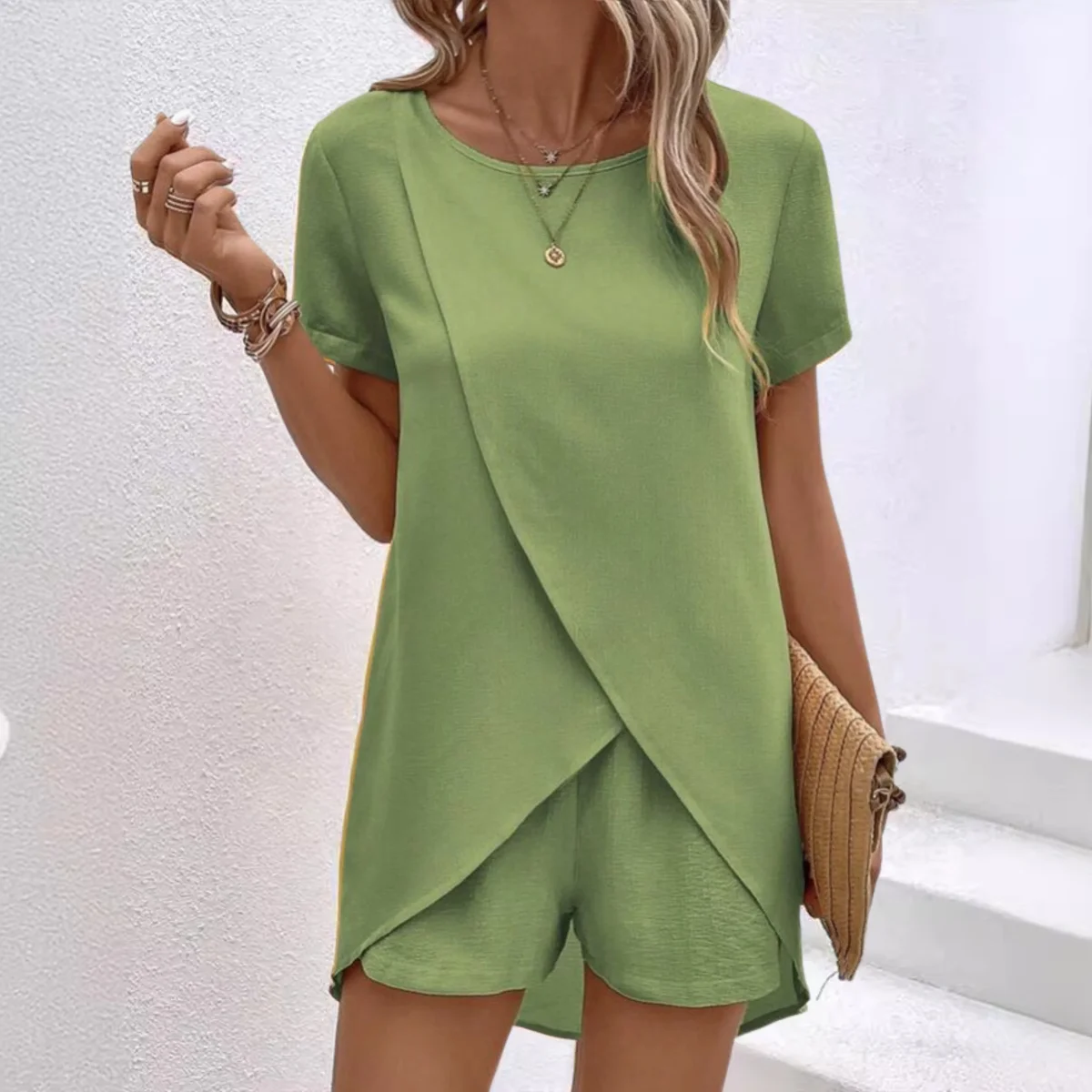 Cet ensemble co-ord estival élégant pour femme est parfait pour les journées chaudes où vous voulez être stylée sans effort. Le haut à ourlet asymétrique apporte une touche moderne, tandis que le short assorti complète le look avec simplicité. Le tissu léger et la coupe détendue rendent l’ensemble idéal pour les sorties décontractées, les brunchs ou les moments de détente. Le design coordonné donne une impression de tenue réfléchie, même lorsque vous optez pour la simplicité. Facile à porter et agréable à porter, cet ensemble devient rapidement un incontournable de l’été. C’est une tenue élégante qui reste pratique au quotidien.