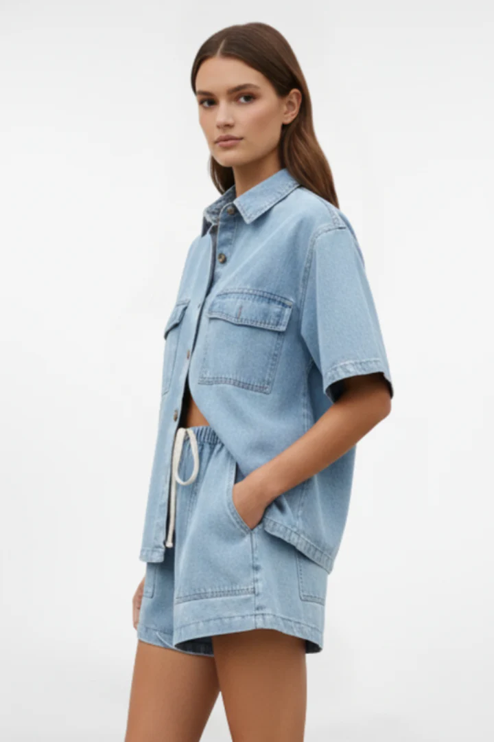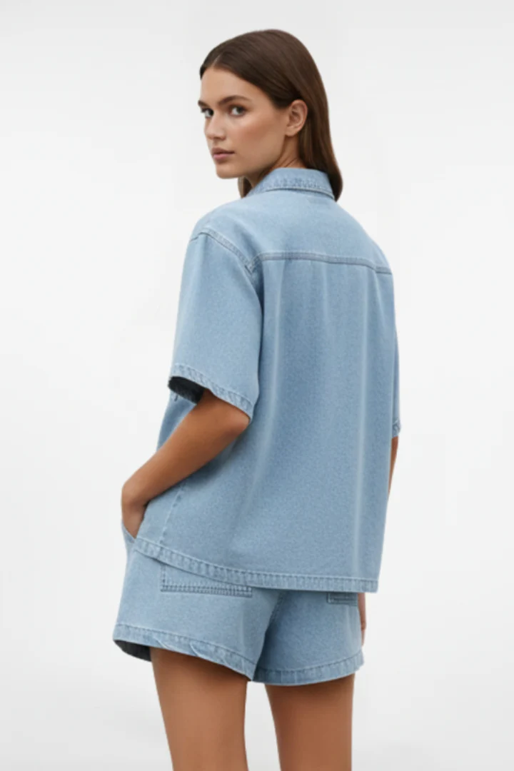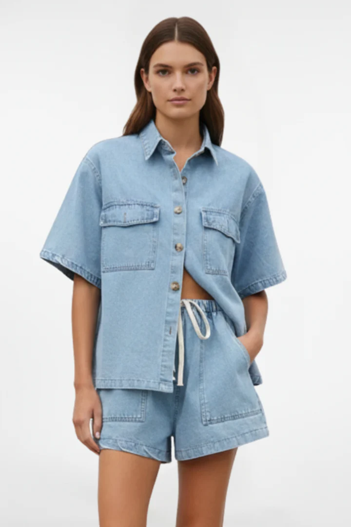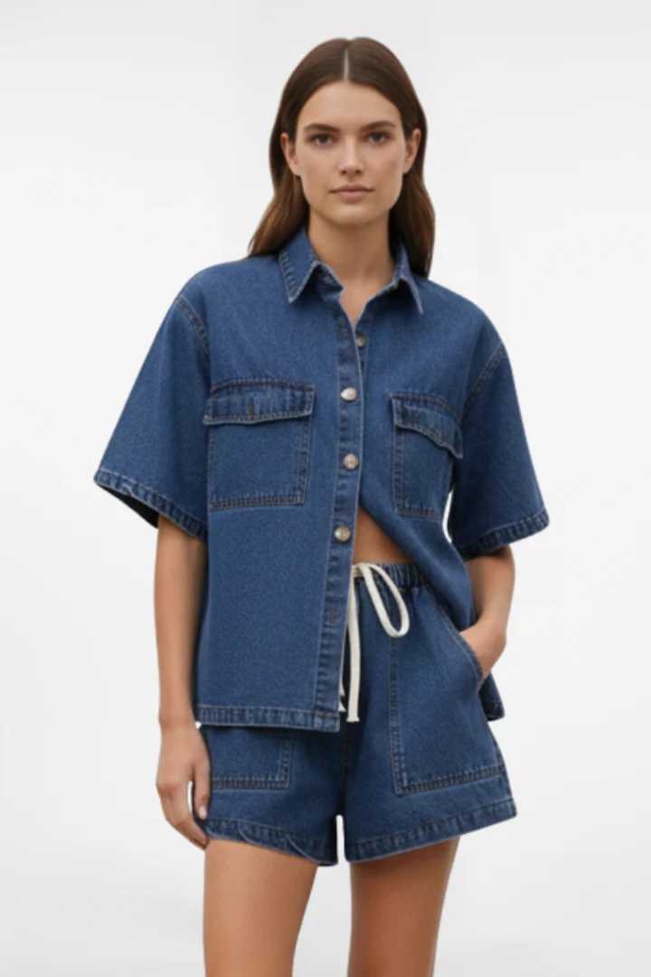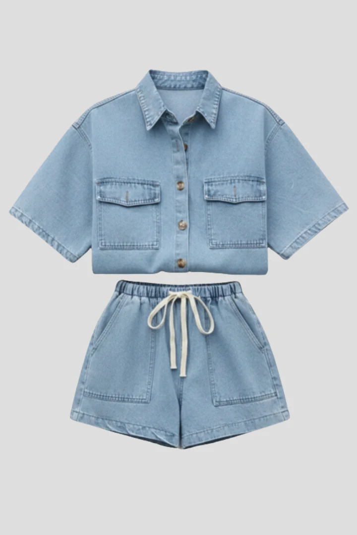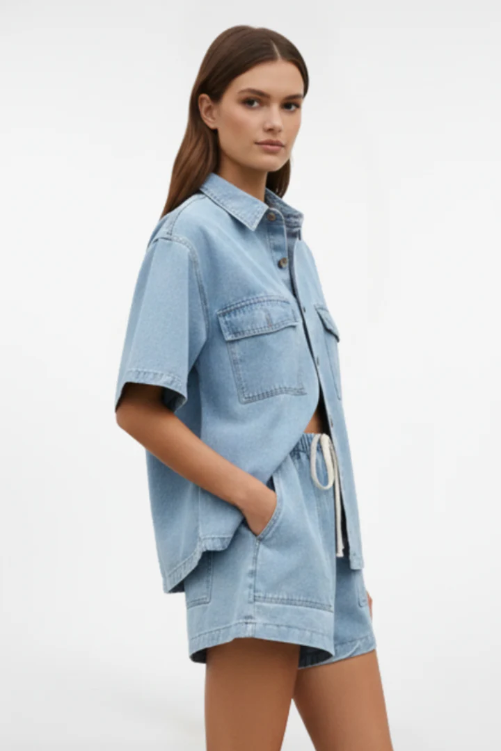 - Style polyvalent: L’ensemble peut être porté comme tenue complète ou séparément avec d’autres pièces. Le denim léger est parfait pour les activités de plein air, les promenades en ville ou les moments de détente estivale.