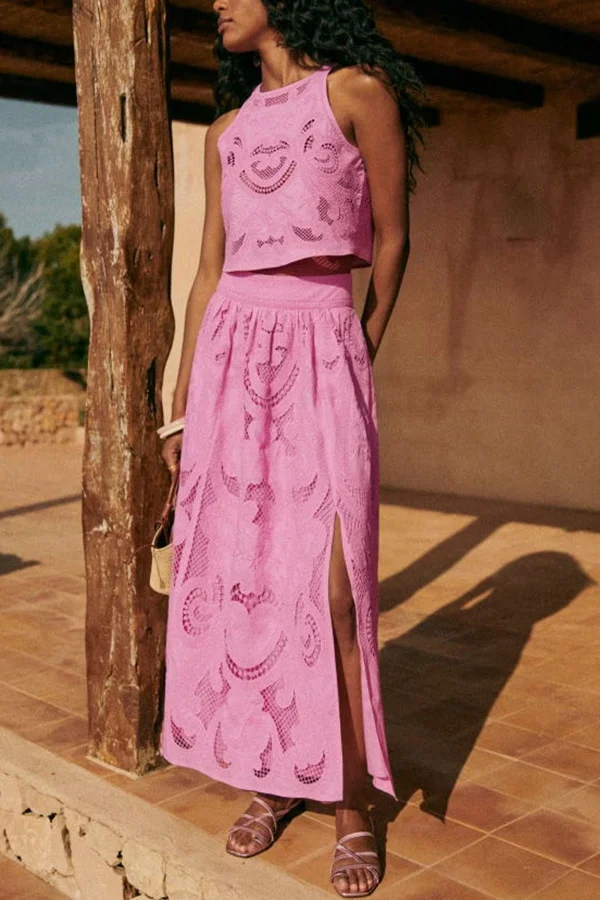 Sublimez vos moments d’été avec cet ensemble deux pièces inspiré des rivages méditerranéens. Le haut court sans manches, orné de broderies raffinées, s’associe à une jupe longue fluide pour un look léger et gracieux. Ce duo respirant allie confort et allure estivale, idéal pour une escapade balnéaire, un apéro au bord de l’eau ou une promenade au coucher du soleil. Polyvalent et stylé, il vous suivra partout avec élégance et simplicité.