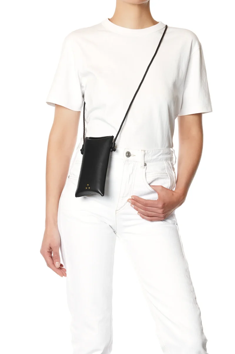 Etui mobile rigide avec lien tressé en cuir. Bandoulière réglable.Longueur du lien 118 cm