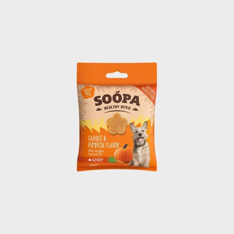Ces friandises d’éducation pour chien à la carotte et citrouille de Soopa sont sans céréales,