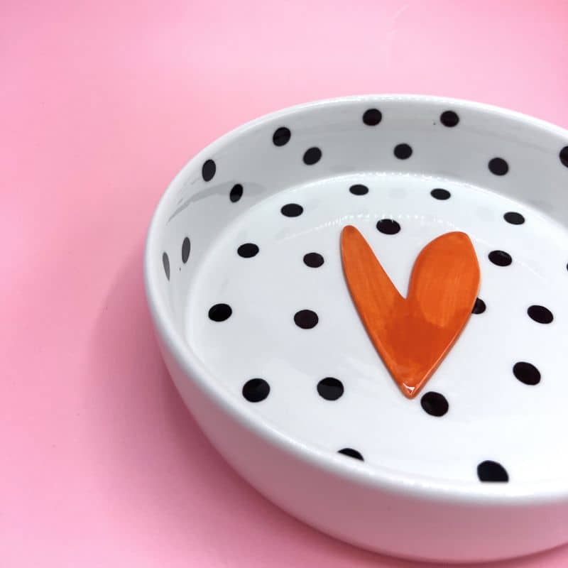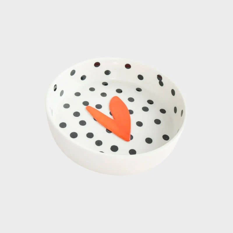 Cette gamelle en céramique peinte à la main Caroline Gardner a un petit coeur rouge au fond en rappel des autres gamelles de la collection.
