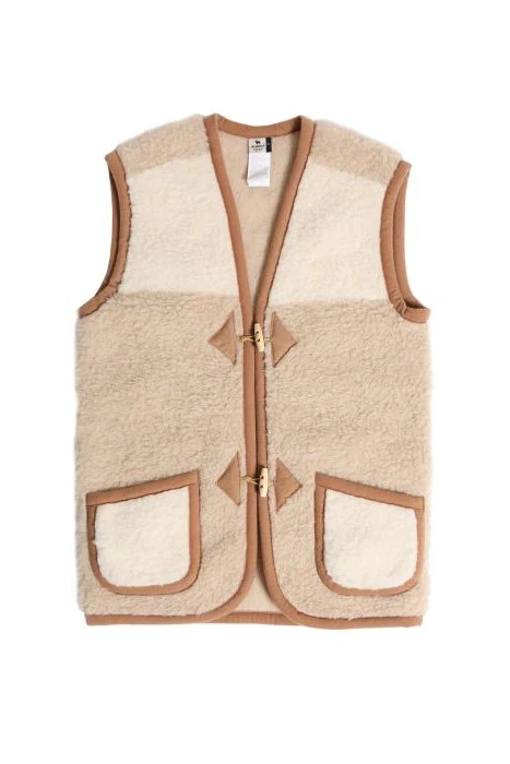 Gilet Adulte polaire bi-couleur beige crème sans manches avec bords contrastants marrons, agréablement doux et bien chaud car en 100% laine. Ce gilet avec sa couleur naturelle pourra se porter facilement sur tout : comme par exemple au dessus d’un gros pull ou une robe.