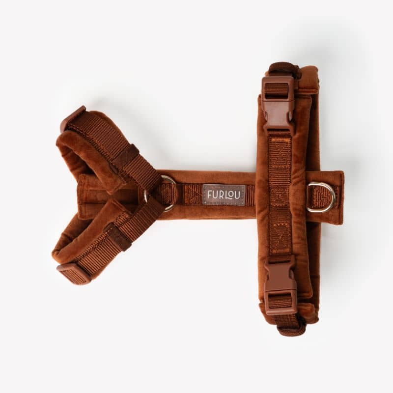 Hyper tendance et confortable, le harnais en velours en H pour chien Orange Terre Cuite « Clay » de la marque Furlou va très vite devenir l’accessoire préféré de votre animal de compagnie.