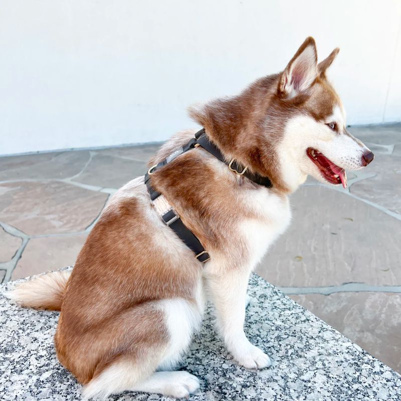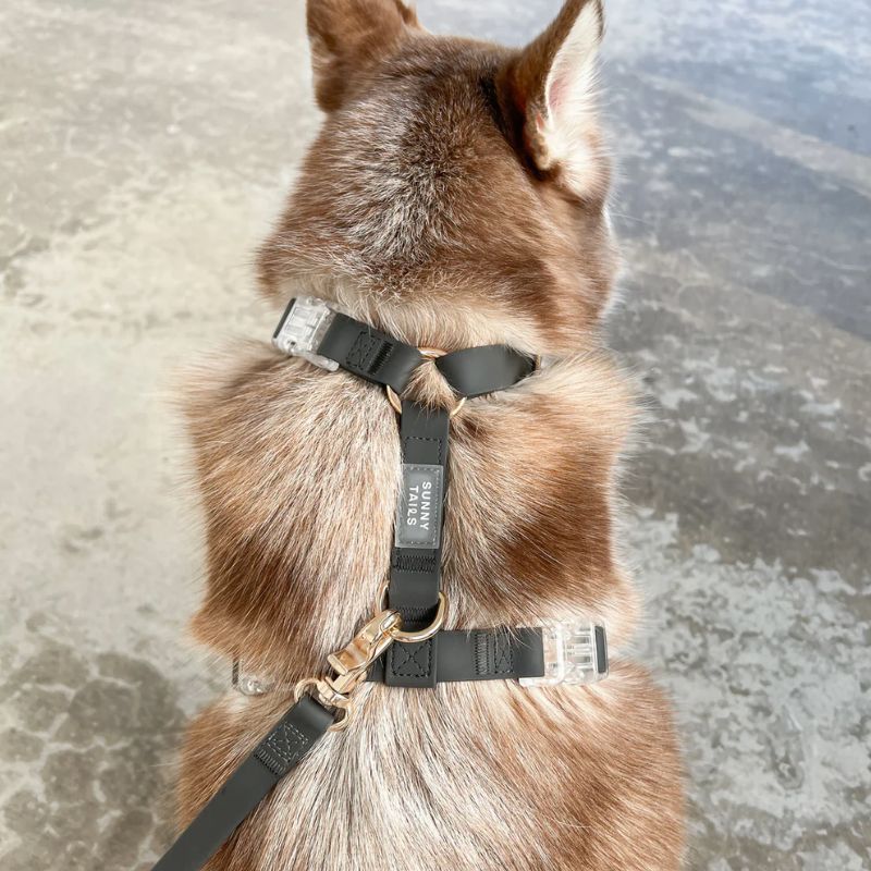 Le harnais pour chien Cloud lite « Ember black » de la marque américaine Shop Sunny Tails vous permet de promener votre chien peu importe la météo grâce à sa matière imperméable. Il est confectionné à partir d’une sangle 100% vegan enduite de PVC – une matière plus durable que le cuir et similaire au biothane – et est également résistant.