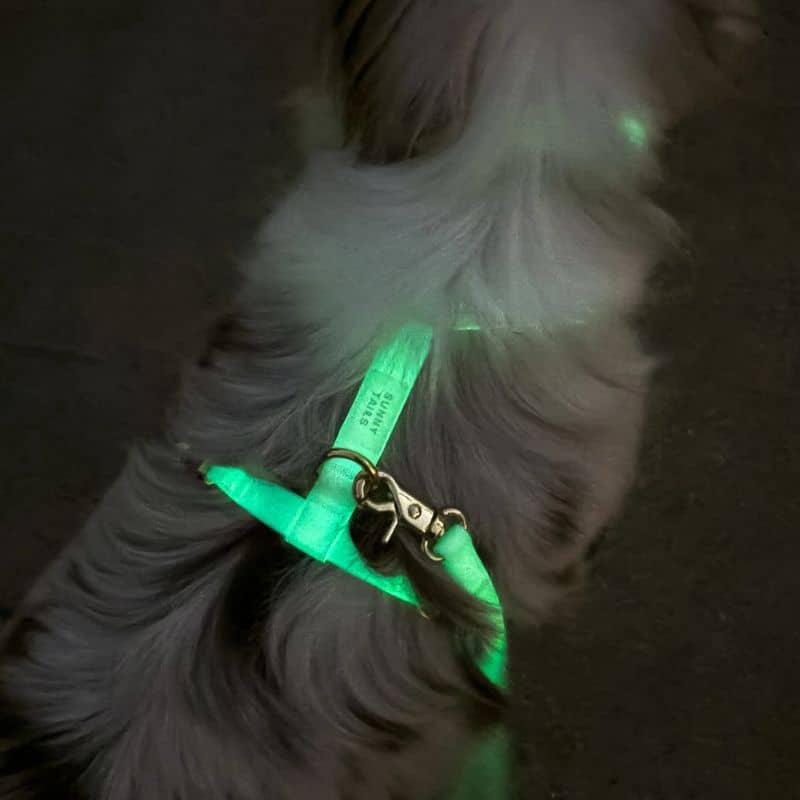 Le harnais pour chien Cloud lite phosphorescent « Lunar glow » de la marque américaine Shop Sunny Tails vous permet de promener votre chien peu importe la météo grâce à sa matière imperméable. Il est confectionné à partir d’une sangle 100% vegan enduite de PVC – une matière plus durable que le cuir et similaire au biothane – et est également résistant.