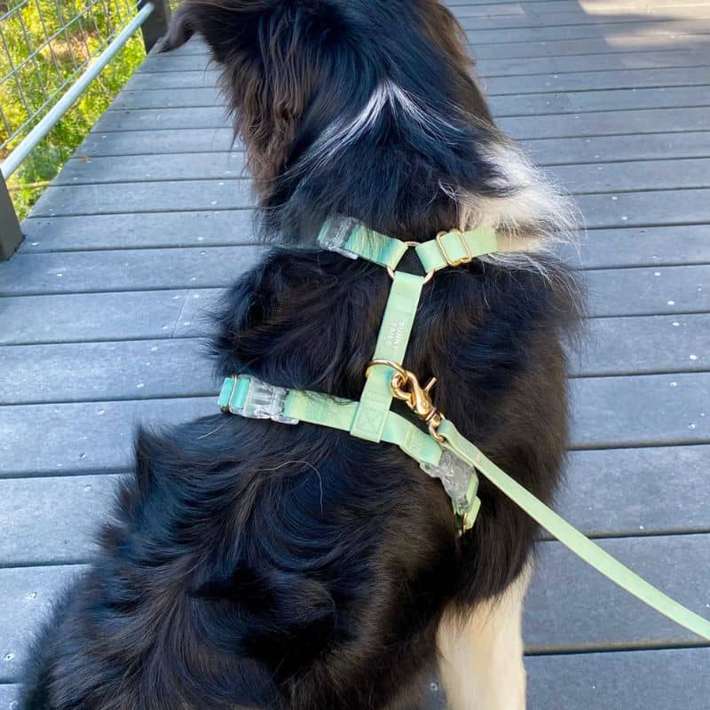 Le harnais pour chien Cloud lite « Pistachio green » de la marque américaine Shop Sunny Tails vous permet de promener votre chien peu importe la météo grâce à sa matière imperméable. Il est confectionné à partir d’une sangle 100% vegan enduite de PVC – une matière plus durable que le cuir et similaire au biothane – et est également résistant.