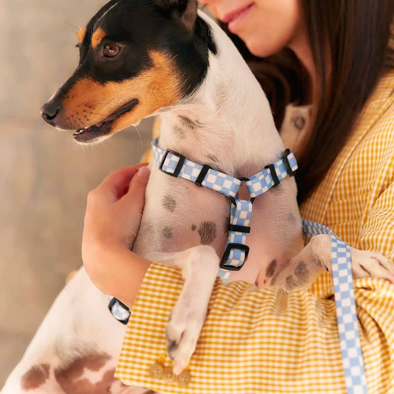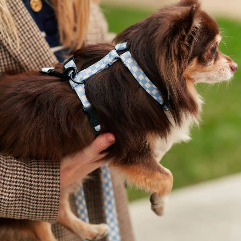 Hyper tendance, le motif “vichy” en bleu ciel s’accorde avec toutes les robes de chien, parfait pour un harnais à utiliser au quotidien et en toute occasion ! Disponible en 3 tailles.