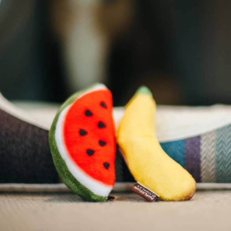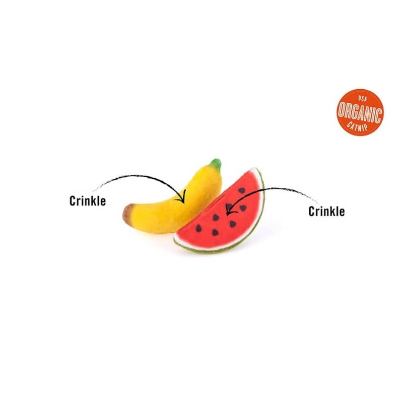 Ce jouet pour chat Tutti Fur-utti P.L.A.Y. est composé de deux peluches fourrées à l’herbe à chat en forme de pastèque et banane 🍉 🍌.