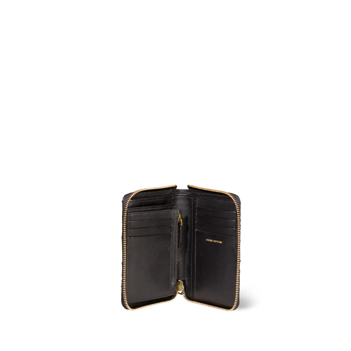 Fermeture entièrement zippée. Un compartiment monnaie zippé. Des emplacements cartes, billets, papiers d’identité.