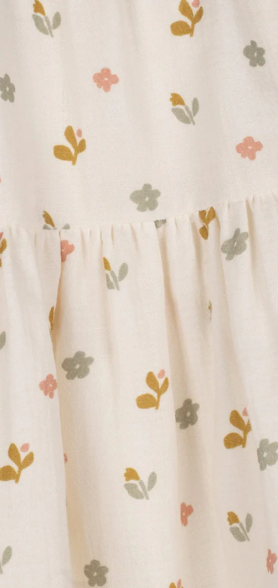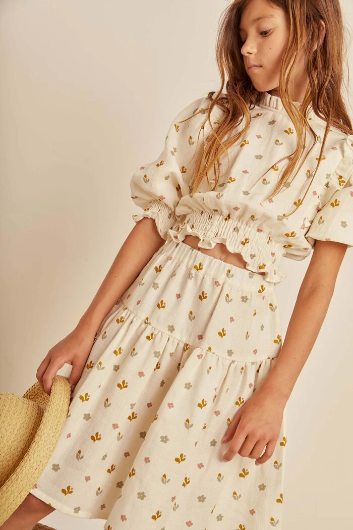 Optez pour un style décontracté et romantique avec la jupe florale en mousseline de coton bio Mia. Les différents niveaux offrent un volume maîtrisé dans lequel votre fille pourra tournoyer à son gré. Il s’agit d’une pièce facile et agréable à porter grâce à son imprimé exclusif doux, qui peut être être combiné par exemple avec le cardigan Giulia et le débardeur en maille Dakota dont la couleur olive rappellent celles des fleurs de la jupe.