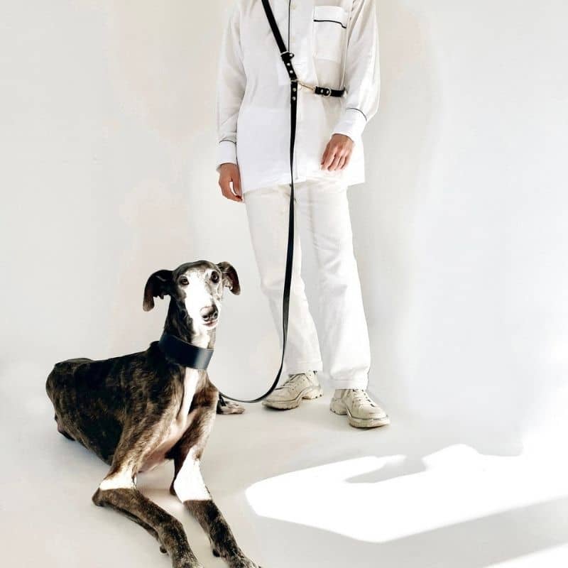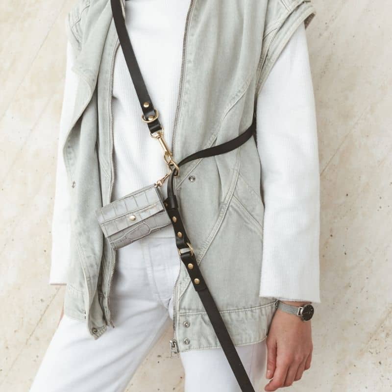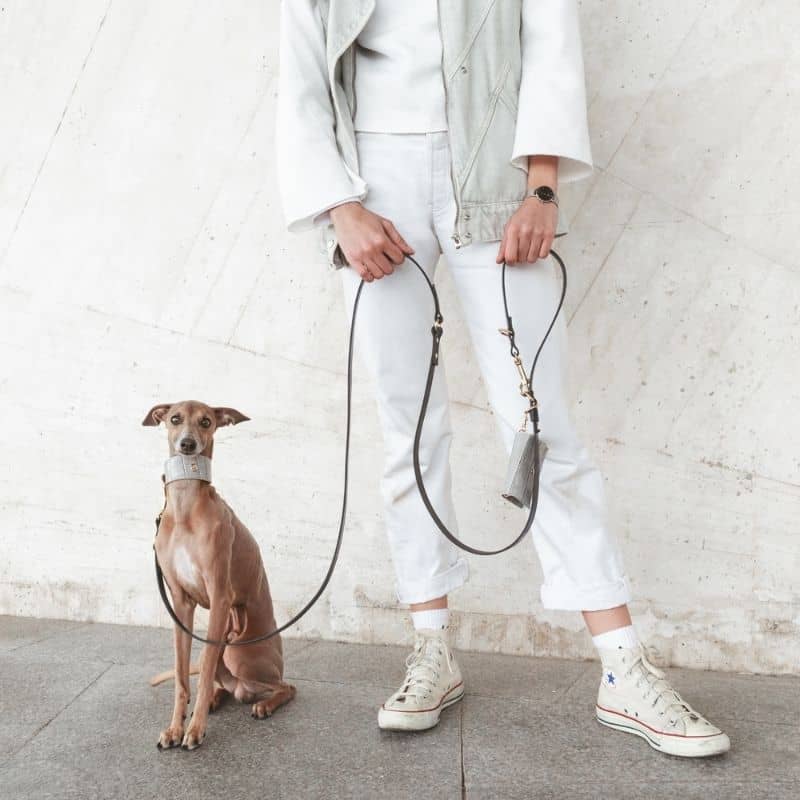 Et pour être à la pointe du style : le distributeur de sacs à déjection assorti en cuir est disponible ici en noir (vous pouvez le fixer à n’importe quel anneau de la laisse, pratique !).