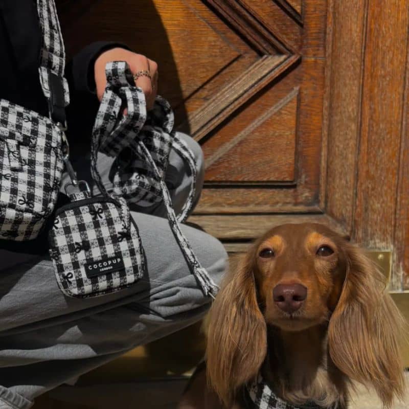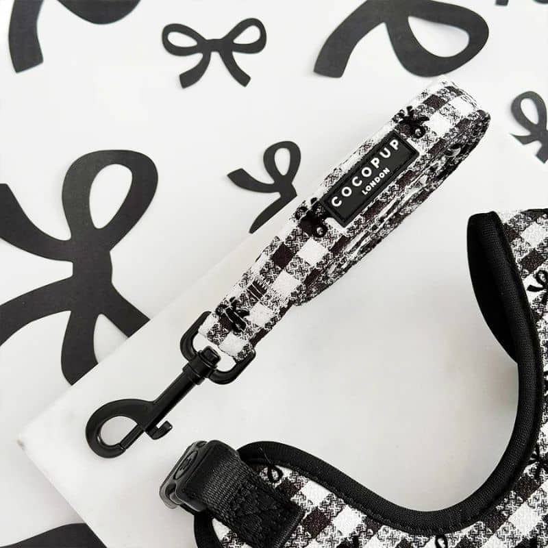 La laisse pour chien motif vichy noir et blanc « Pup in Paris« de la marque Cocopup London apportera une note chic et rétro aux balades de votre poilu ! Le tissu à carreaux noir et blanc avec ses noeuds brodés ajouteront une touche raffinée et tendance aux promenades de votre chien.