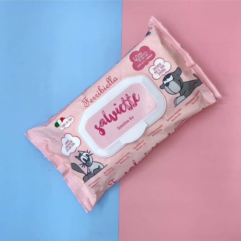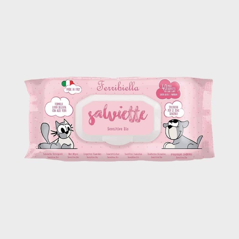 Ces lingettes nettoyantes pour chien, chiot et chat Sensitive Bio de la marque Ferribiella contiennent des ingrédients bio hydratants et apaisants adaptés aux zones délicates.