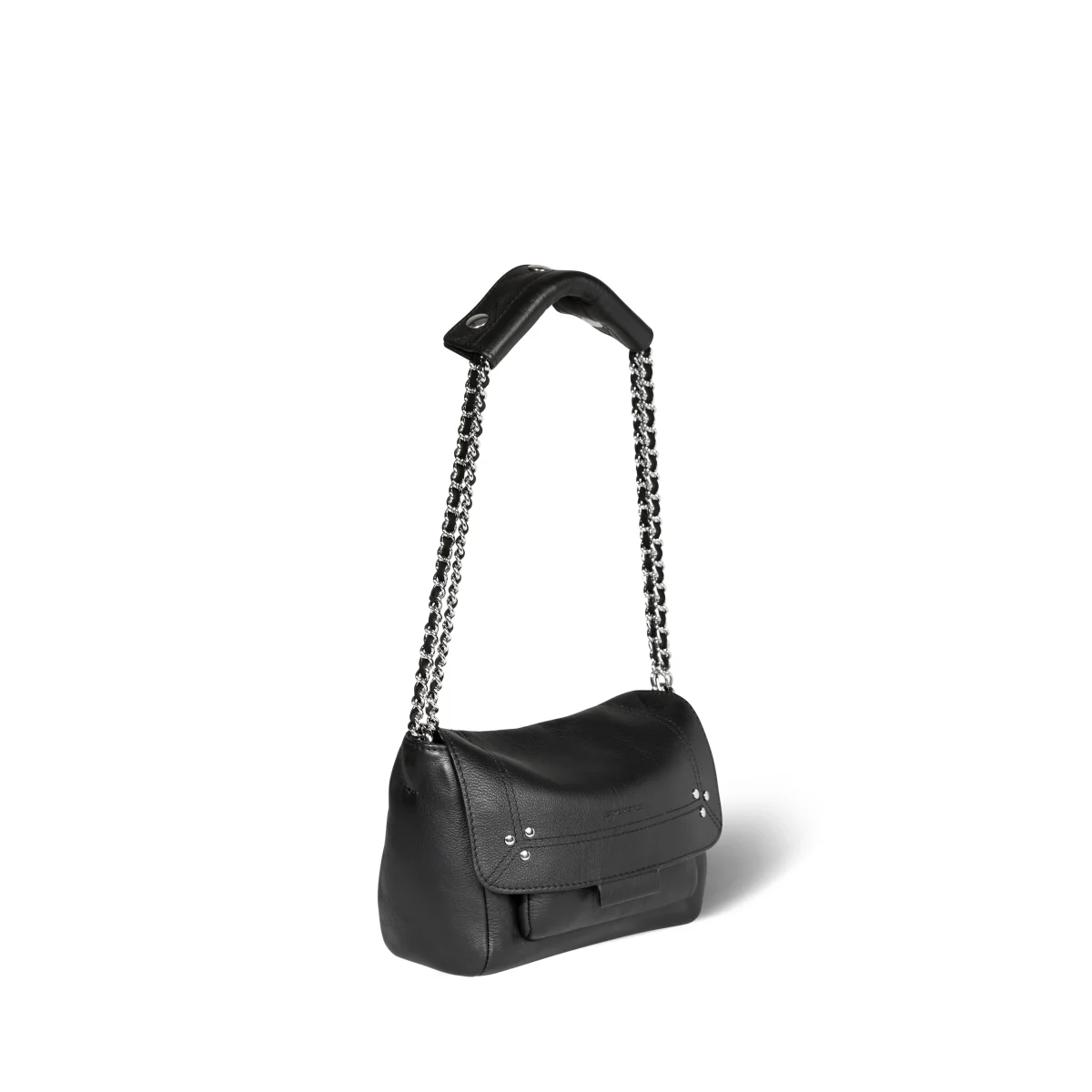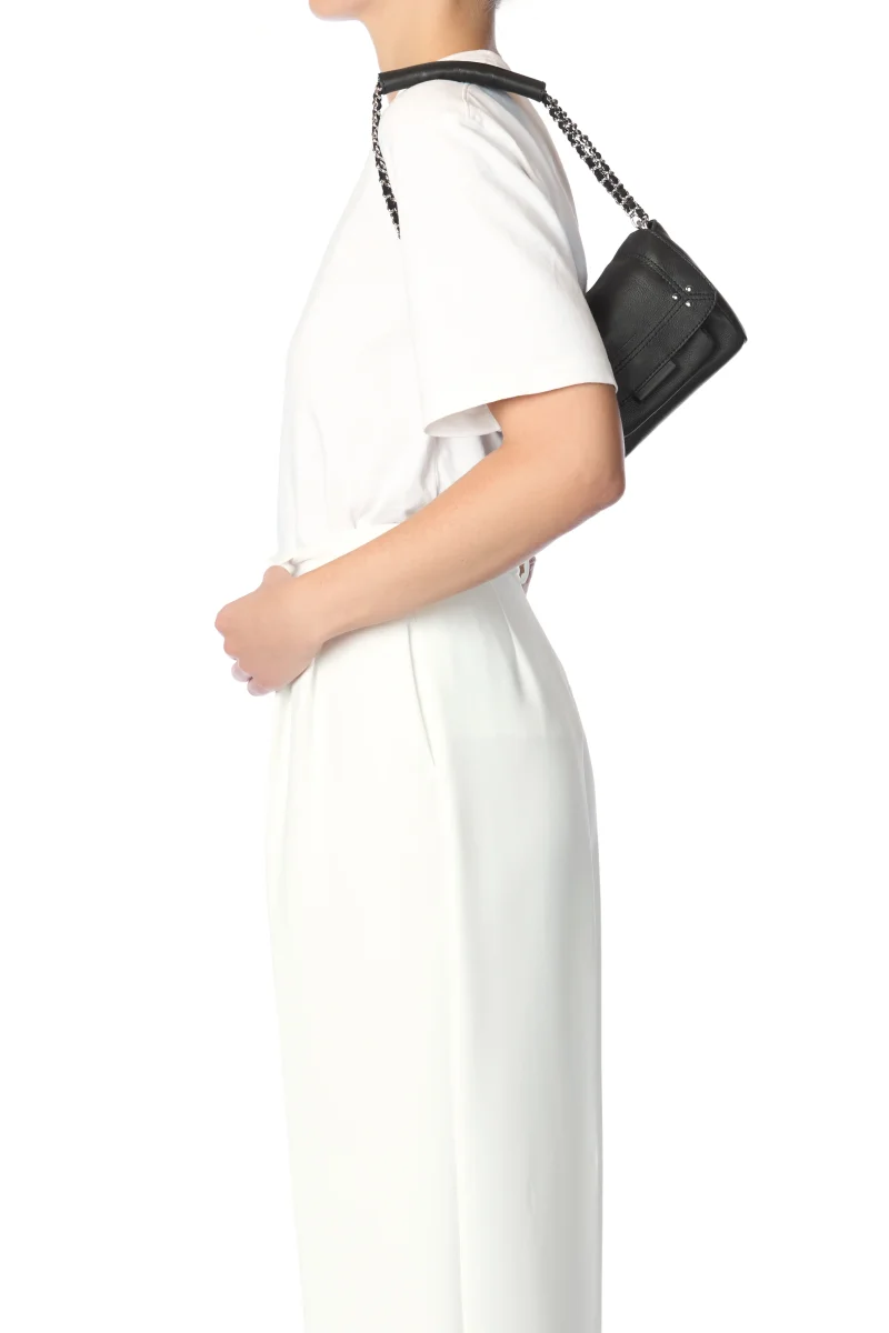 Une bandoulière chaîne et cuir amovible et ajustable en deux longueurs; mesurant au maximum 105 cm et dimension au plus court 52,5 cm avec large patte épaule en cuir pressionnée. Rabat avec fermeture aimantée. Sac organisé avec un grand compartiment et une poche intérieure. Une petite poche sous le rabat. Un lien porte-clés à l’intérieur du sac.