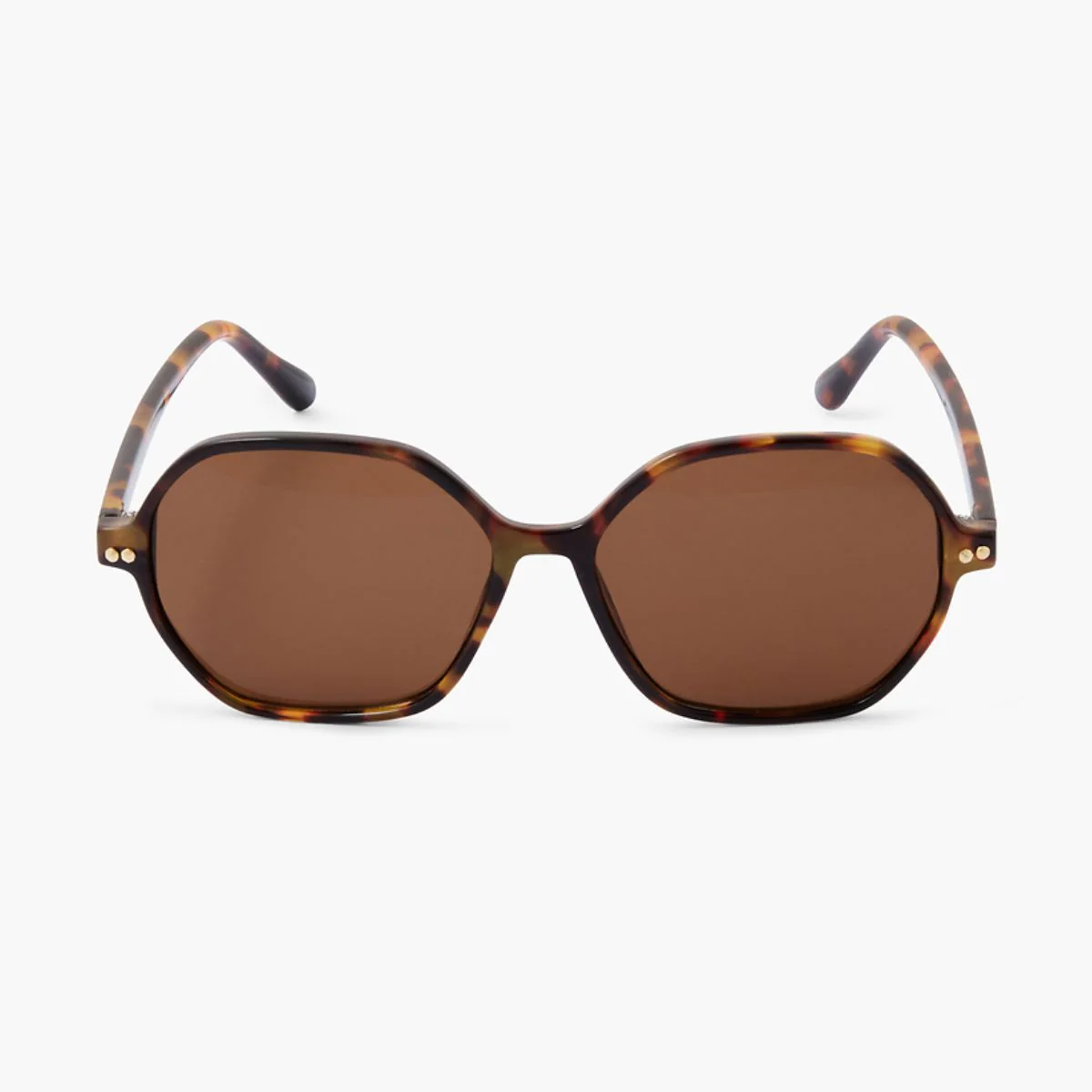 Forme : carrée Coloris : marron Couleur des verres : marron Protection : catégorie 3 – 100% UV Matériaux : polycarbonate, cuivre Hauteur du verre : 5,1 cm Largeur du verre : 5,8 cm Longueur branches : 15 cm Taille du pont : 1,3 cm