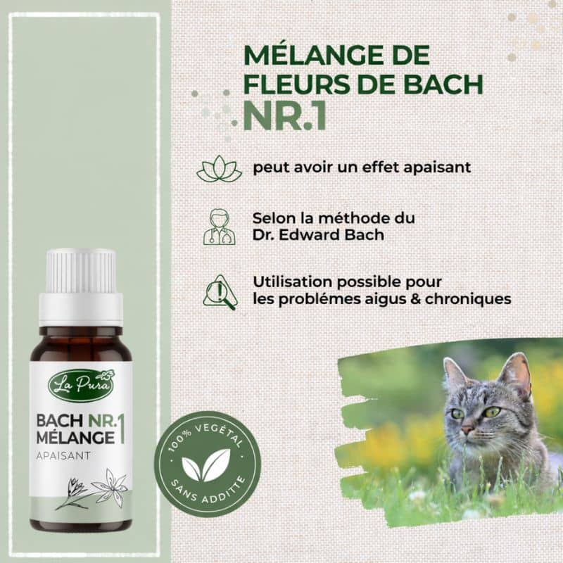 Ce mélange de Fleurs de Bach n°1 pour chien et chat de la marque La Pura peut avoir une influence apaisante dans des situations de stress mental et peut favoriser une attitude positive chez l’animal.