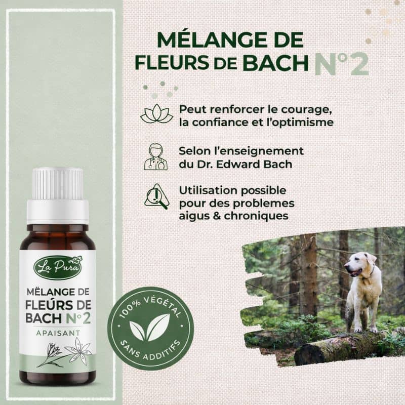 Ce mélange de Fleurs de Bach n°2 pour chien et chat de la marque La Pura permet de renforcer le courage, la confiance et l’assurance de votre animal.