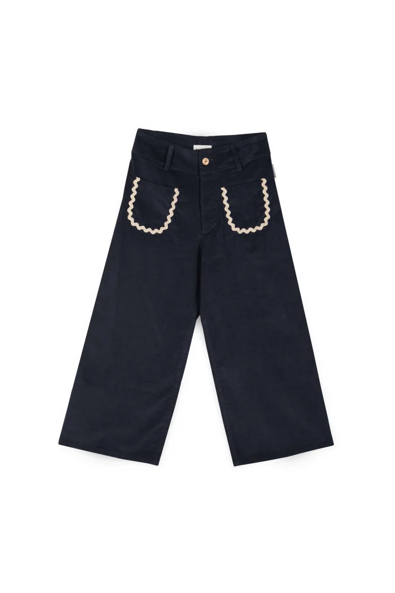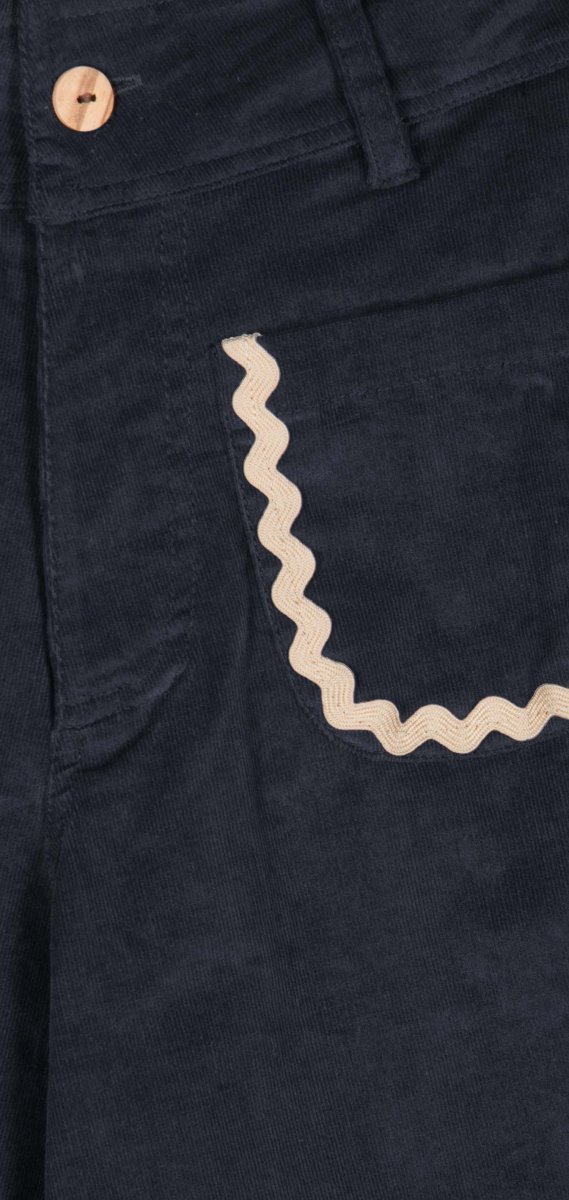 Bianca, le pantalon en velours au tomber parfait : ajusté à la taille et large au niveau des jambes. Le petit détail qui fait la différence : ses poches plaquées bordées de ruban ondulé crème pour un contraste juste adorable avec le bleu nuit du pantalon. Et que dire de la douceur de son velours en coton côtelé bitume ! Un pantalon donc très agréable à porter avec sa coupe wide et qui va avec tout : que ce soit avec la blouse Tartan Bella ou encore nos pulls Gala.