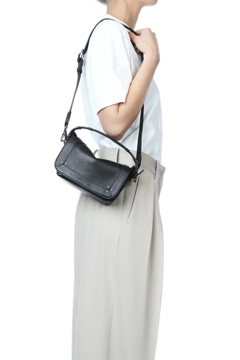 Une anse en cuir matelassée et une longue bandoulière réglable et amovible de 70 cm à 97 cm. Fermeture par un rabat en cuir aimanté. Une poche extérieure zippée à l’arrière du sac. Un lien porte-clés à l’intérieur du sac. Un design épure, aux nombreux détails artisanaux minutieux et discrets et aux lignes déstructurées. Le travail de précision sur les quatre piqûres des anses met en valeur la qualité et le soin apportés à chaque détail. Les enchapes de la bandoulière et des anses présentent un relief évoquant les harnais d’équitation, ajoutant une touche d’élégance et de tradition.
